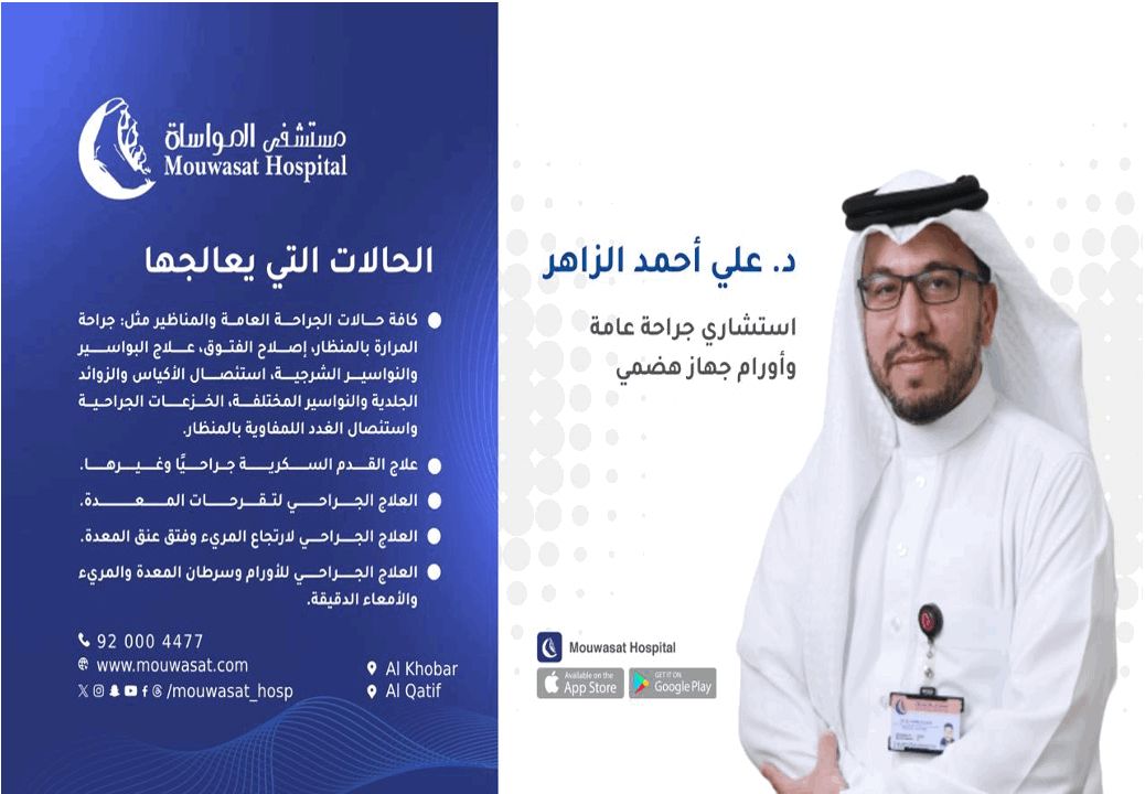 د. علي الزاهر يقدم خدمات الجراحة العامة وأورام الجهاز الهضمي في مستشفى المواساة بالقطيف