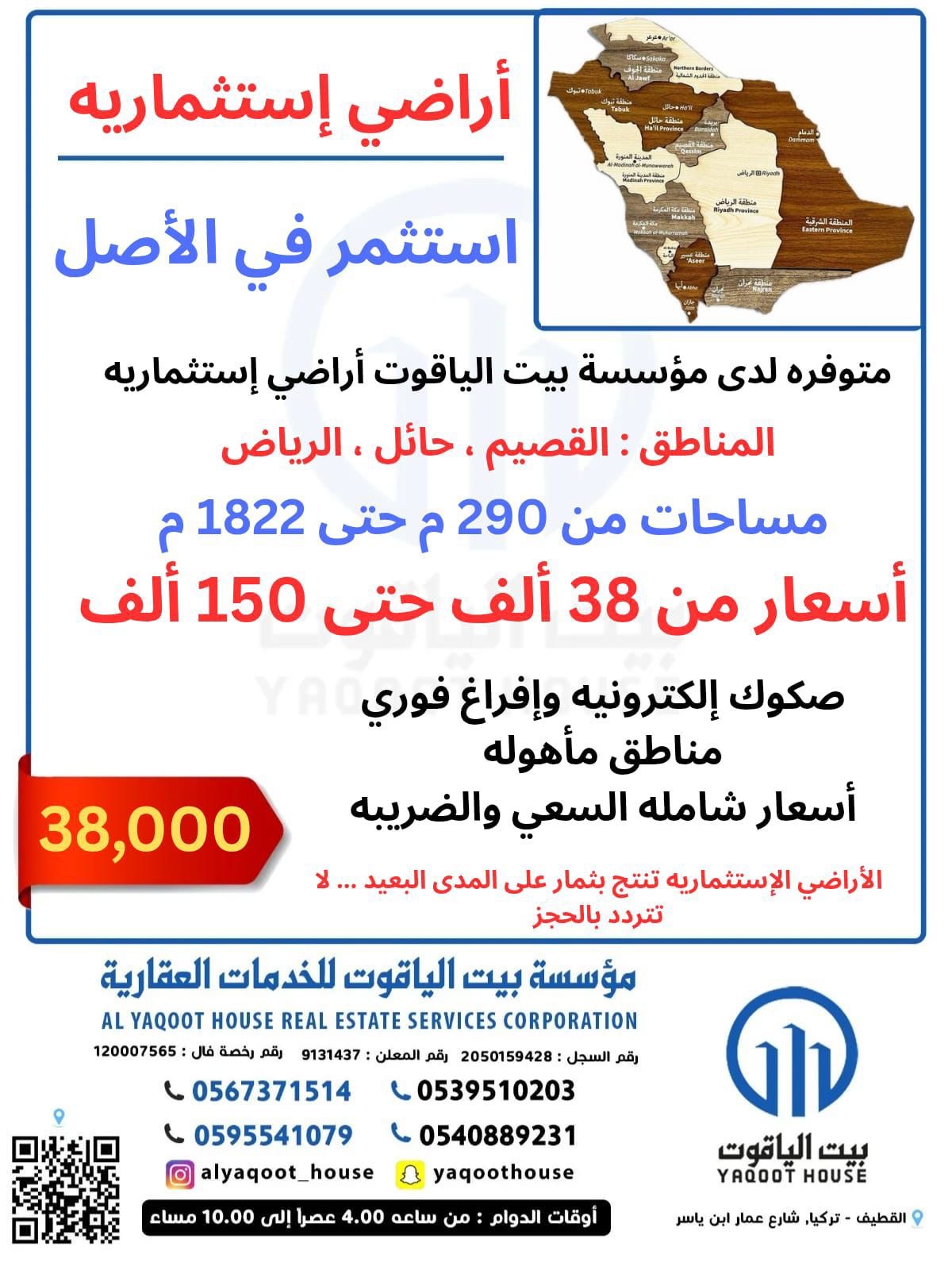 الادخار في العقار مع بيت الياقوت.. بأسعار تبدأ من 38 ألف ريال ومساحات من 290م² حتى 1822م²