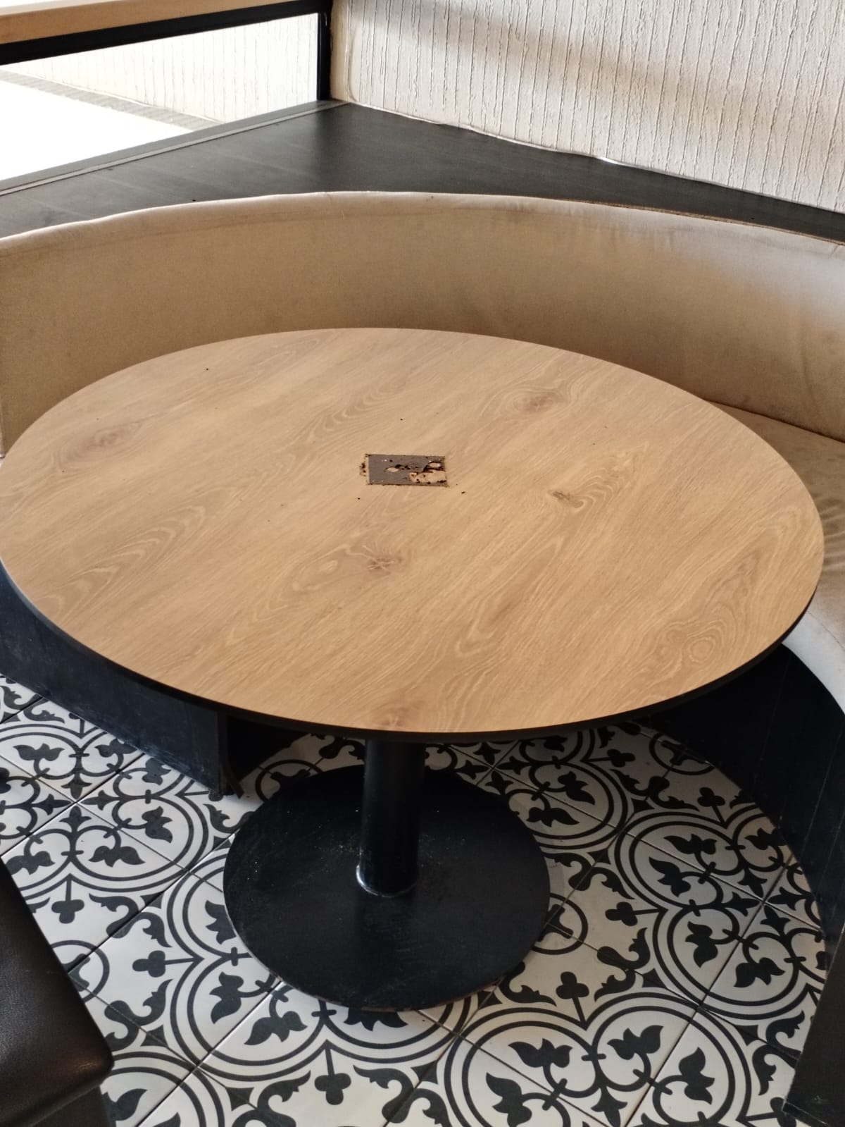 7- عدد 10 طاولات سطح خشبي من ريتان هاوس مع الكراسي بجلد أسود.