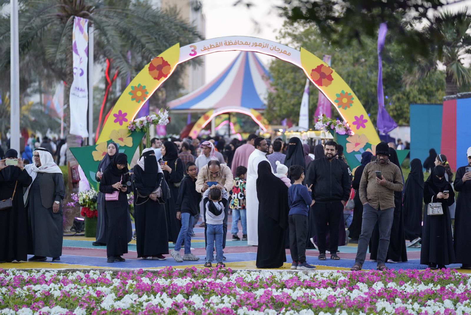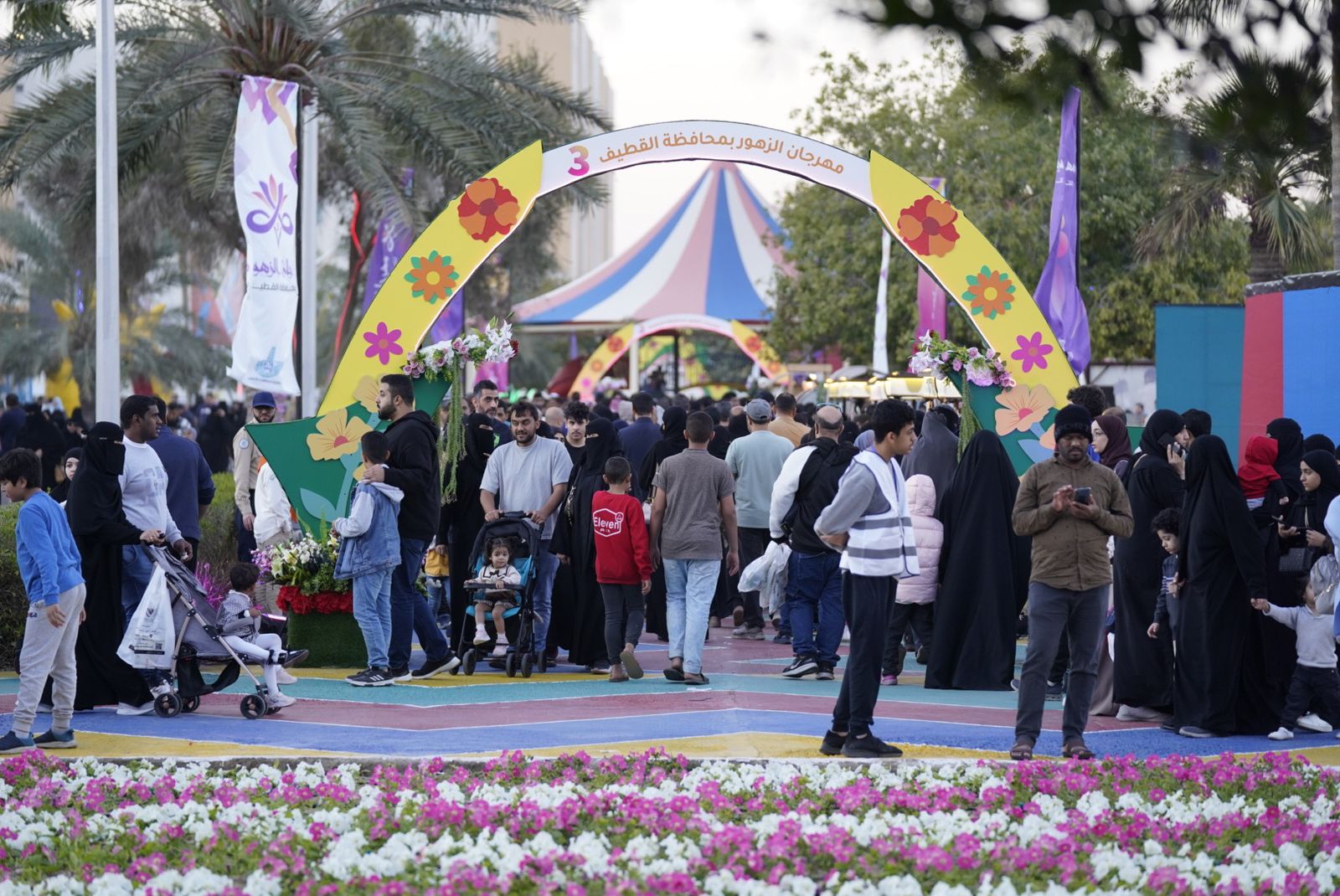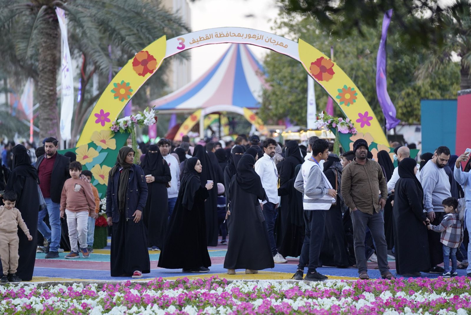 شهد "مهرجان الزهور الثالث" الذي أطلقته بلدية محافظة القطيف، في الثامن عشر من يناير 2024م ويمتد لعشرة أيام، توافد آلاف الزوار من القطيف وخارجها للاستمتاع بالأجواء الجميلة وسط الزهور، والفعاليات الترفيهية والاجتماعية والتوعوية والبيئية التي تناسب كافة شرائح المجتمع بمختلف اهتماماتهم، حيث بلغت إحصائية زوار المهرجان لليوم الثالث أكثر من 60 ألف زائر.