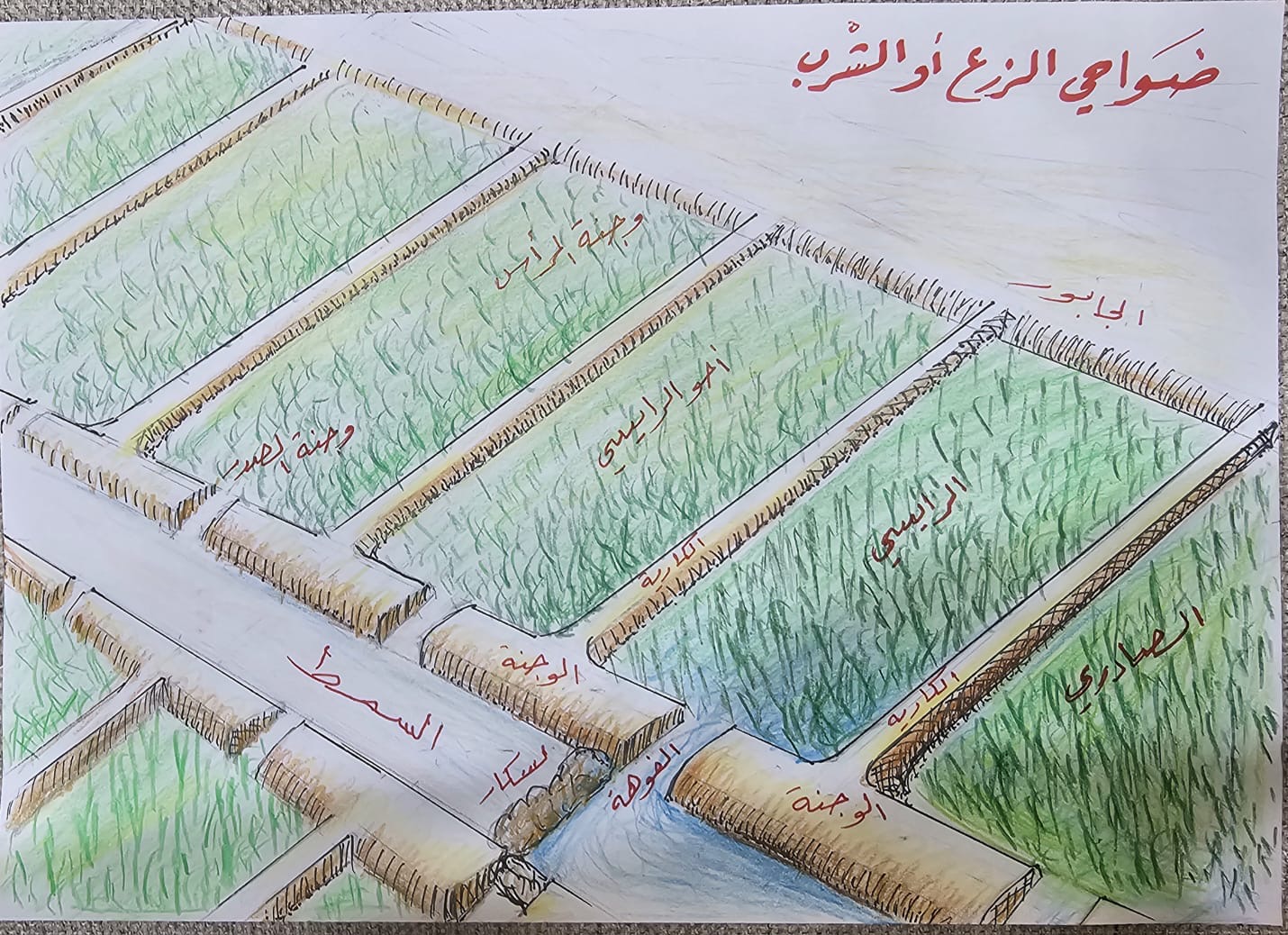 حين يمتلئ المستطيل بالماء أي "الشرب أو الضاحية" تغلق "الفوهة" بقطع من ليف مشبع بالرمل، يسمى "اسكار" أو "توليمة" ليذهب الماء للمستطيل الثاني ثم الثالث والرابع وهكذا. من ضمن تعريفات المستطيل الداخلية، فالأمام يسمى "وجنة الصدر" والقسم الأخير و"جنة الرأس"، يحده "الجابور" ويكون ضعف مساحة "الكاريه" مرتين وهو الموازي للوجنات كلها من الجهة المقابلة. هذه الدواليب الزراعية البالغ عددها أكثر من 400 دولاب قبل 100 عام معروفة بأسمائها، وتعداد مساحاتها وجودة منتوجاتها، تعاقبت على إعمارها أجيال وأجيال، لكن جل المزارعين العاملين فيها لا يملكونها! فهم يستأجرون الأرض من أحد الملاك ويقومون باستصلاحها طوال عام أو عامين أو خمس باتفاق مكتوب قابل للتجدد، ثمة فلاحون يملكون بعضًا من الدواليب، لكن غالبية المزارعين يأخذون الدولاب "بالاكار" أي استئجار، وهم مقيدون بالتزام عند نهاية كل موسم، فعند استخراج المحصول السنوي من الدولاب يوزع على أربع فئات حسب عدد نوعية ثمر النخيل وتعداد "گلات التمر":