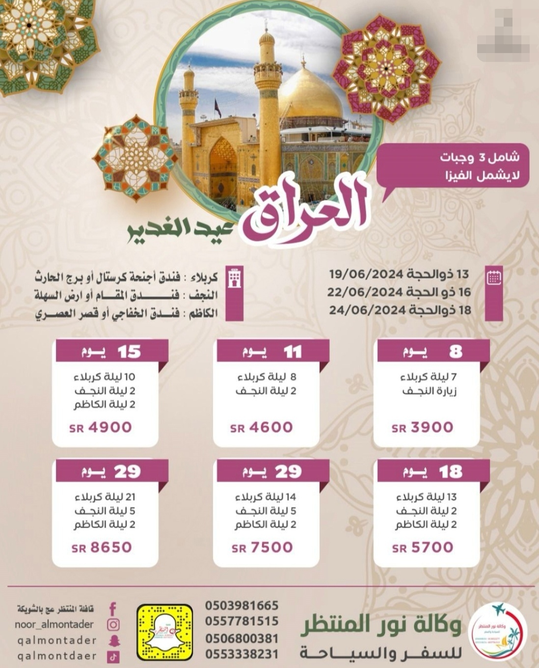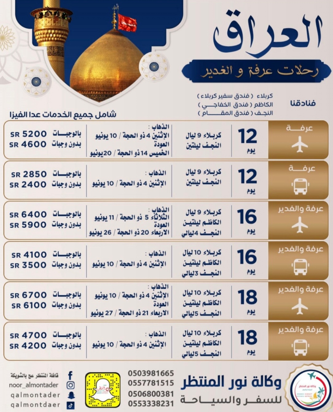 وكالة نور المنتظر للسفر والسياحة تسيِّر رحلات العراق إلى عرفة والغدير في شهر ذي الحجة للعام 1445