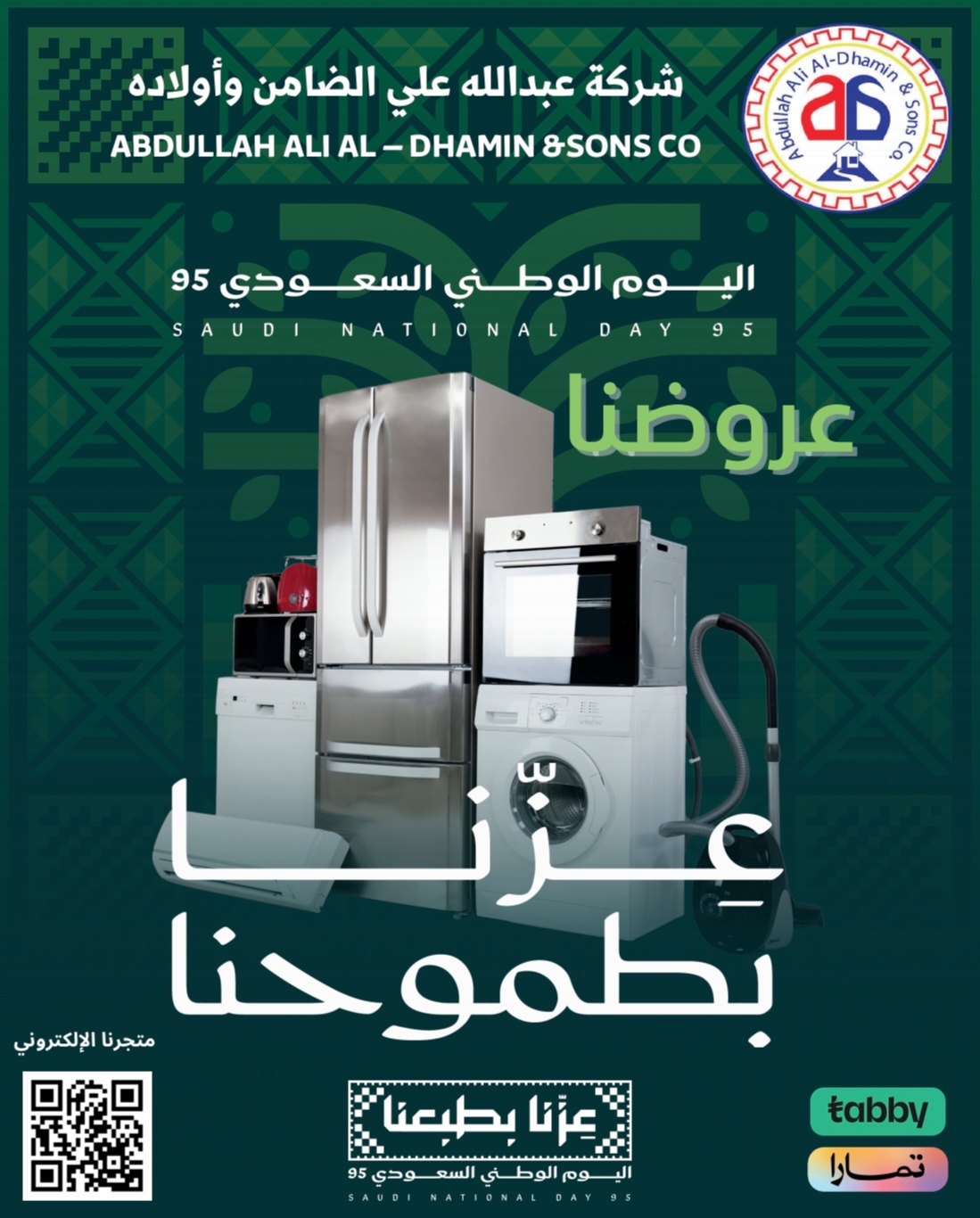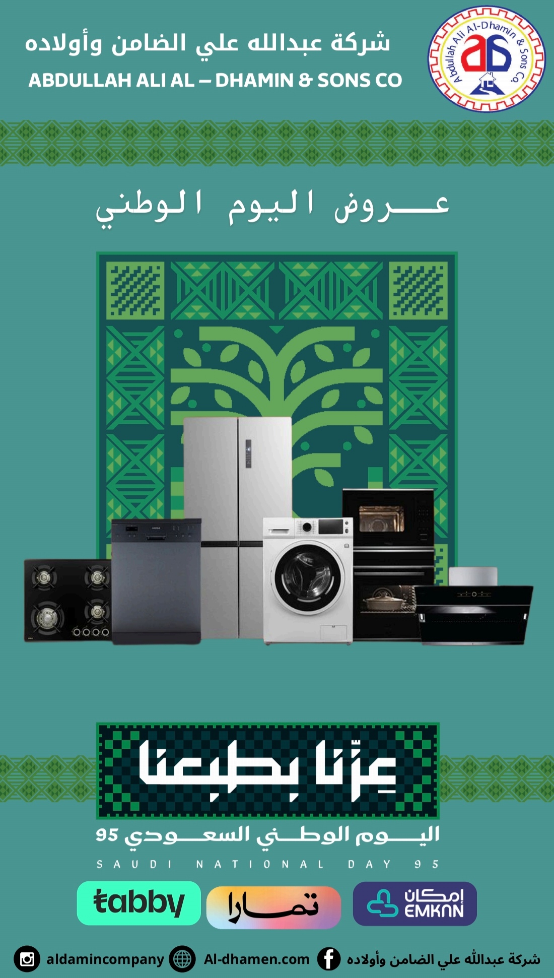 تعلن شركة عبدالله علي الضامن وأولاده عن عروض «اليوم الوطني الـ 95.. عزنا بطبعنا» على جميع الأجهزة الكهربائية والمنزلية المتنوعة والحديثة.