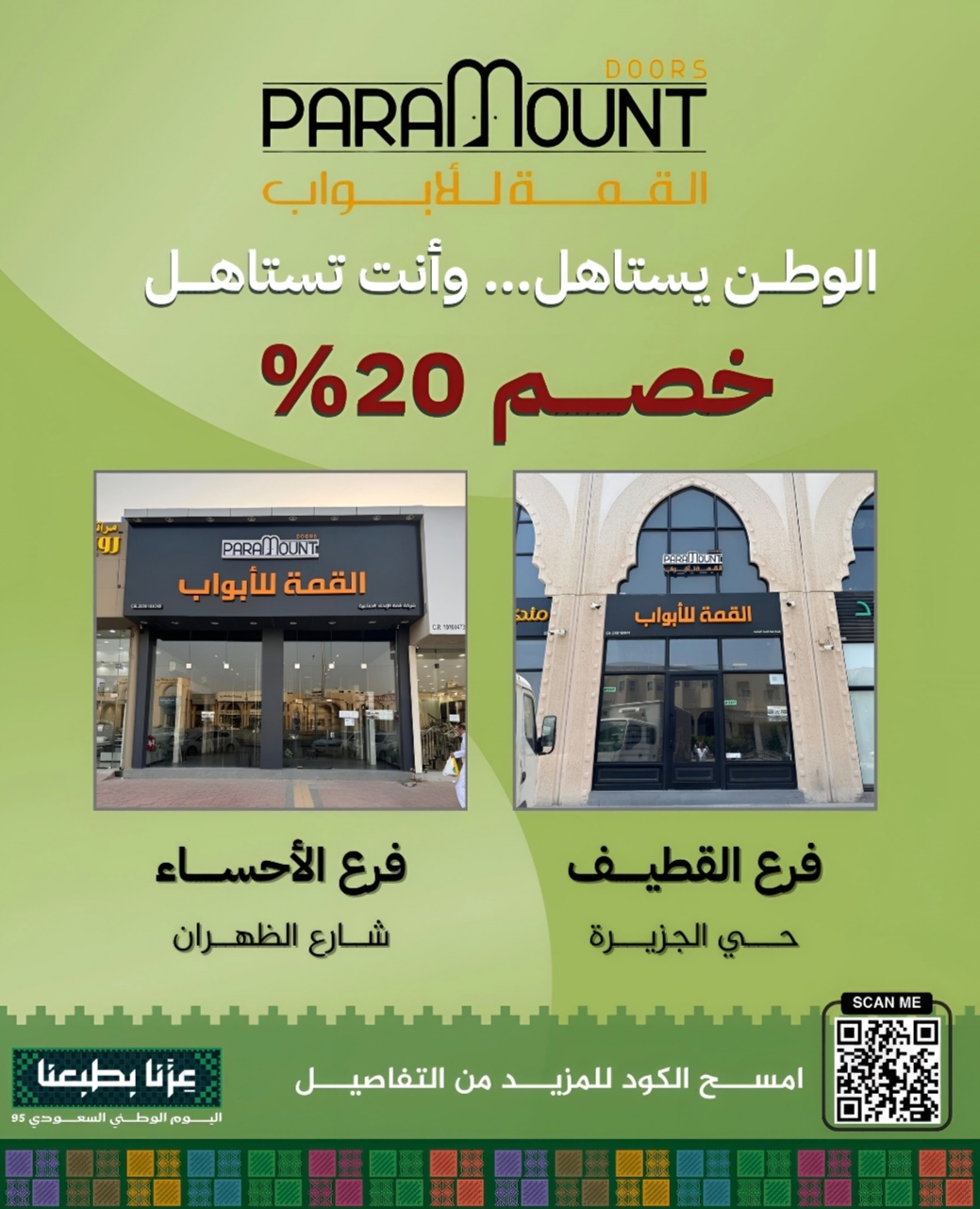 خصومات 20%.. اغتنموا تخفيضات اليوم الوطني الـ95 عند «القمة للأبواب»