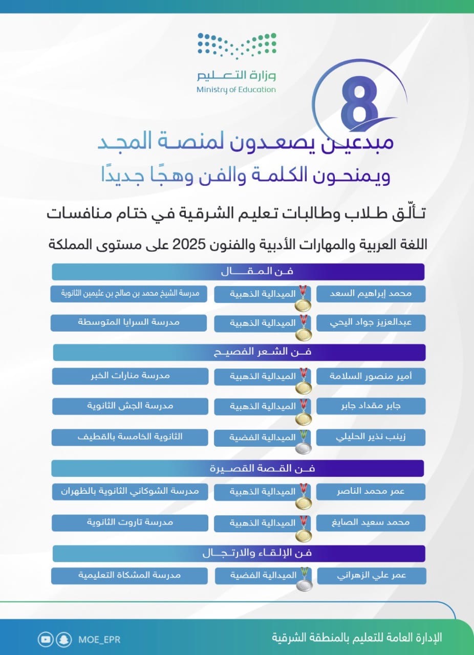 تألّق طلاب وطالبات محافظة القطيف في ختام منافسات اللغة العربية والمهارات الأدبية والفنون 2025 على مستوى المملكة، بعد أن صعدوا إلى منصة المجد ممثلين تعليم الشرقية، مقدمين أداءً لافتًا يجسّد قوة الموهبة وعمق الإبداع، ويعزز حضور القطيف المتقدم في ميادين الأدب والفنون.