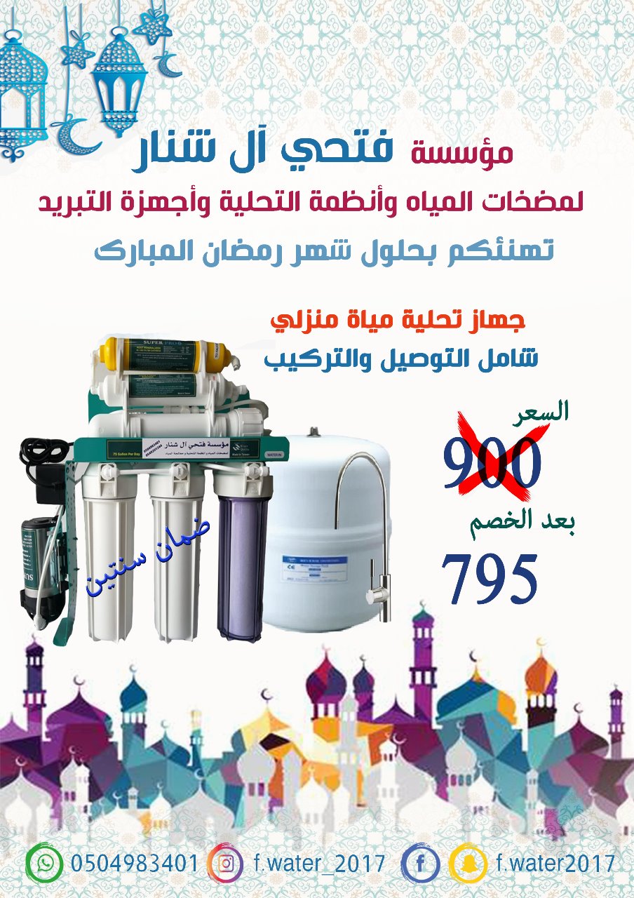 مؤسسة فتحي الشنار لمضخات المياه وأنظمة التحلية وأجهزة التبريد ، تهنئكم بحلول شهر رمضان المبارك وتعلن عن توفر العرض التالي: