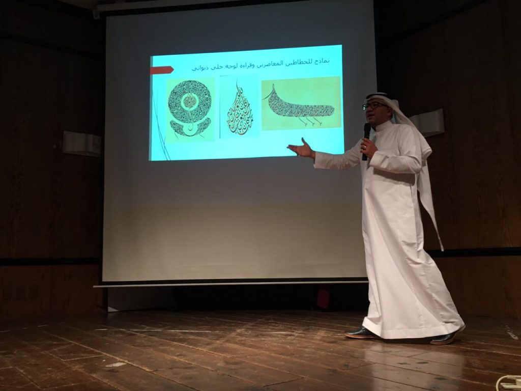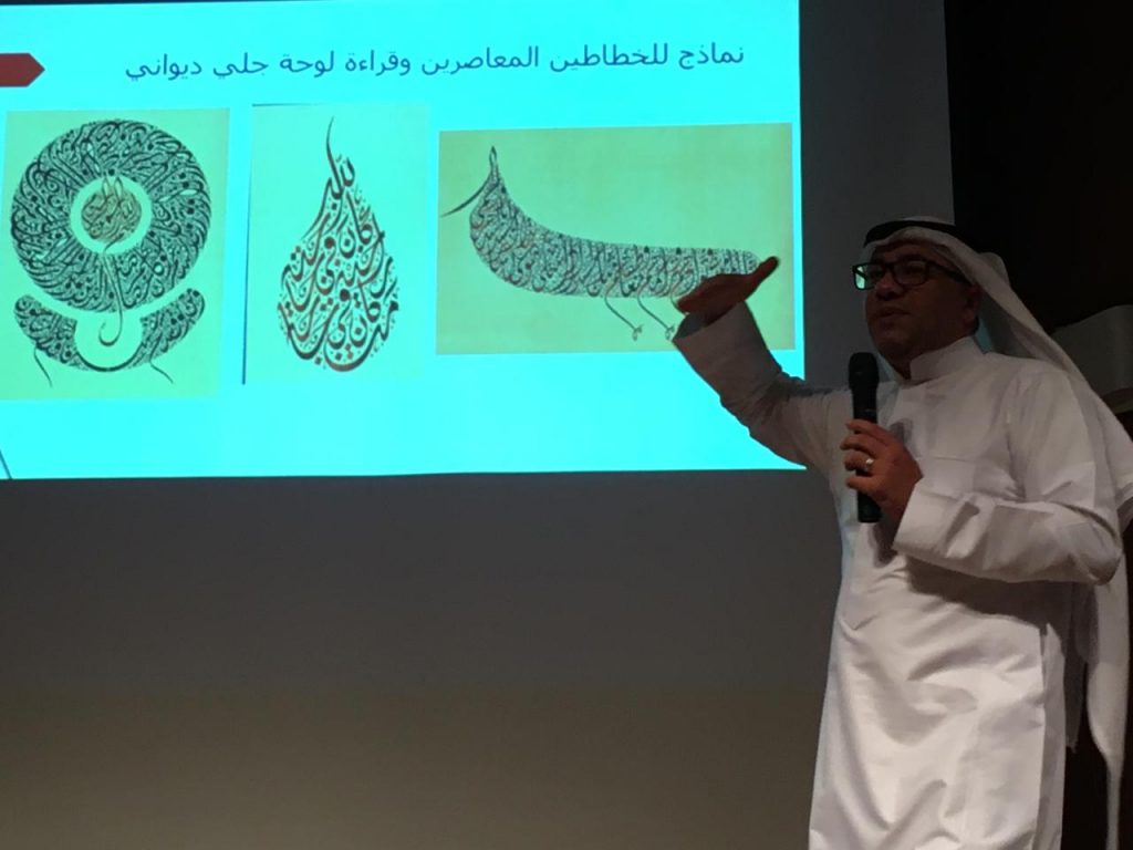 واستعرض بعض جماليات الخط الديواني بنوعيه العادي والجلي، حيث تمت قراءتها مع الحضور مع التأكيد على أنه يمر بمراحل كثيرة من الأعداد والتجربة، موضحًا موقع قوة الحرف في الكلمة واللوحة مع ما يحمل من نسبة وتناسب بصورة أفقية وعمودية.