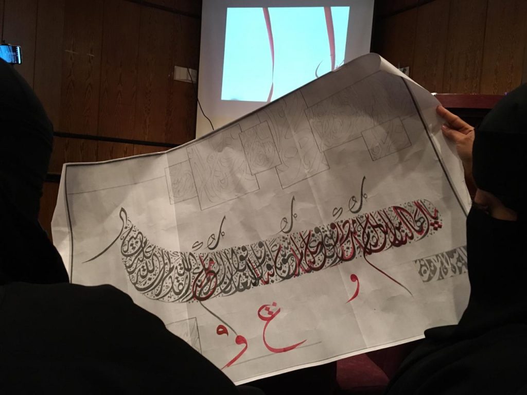 واختتمت الورشة بتطبيق الكتابة الخطية على قواعد الخط الديواني، وشرح كيف تتجزأ اللوحة والعلاقة بين الحروف والكلمات.