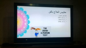 وتطرقت لبعض مقاييس العلاج بالفن منها رسم القصة والجسر والبيت والشجره وكل لوحةلها دلالاته وتفسيرها.