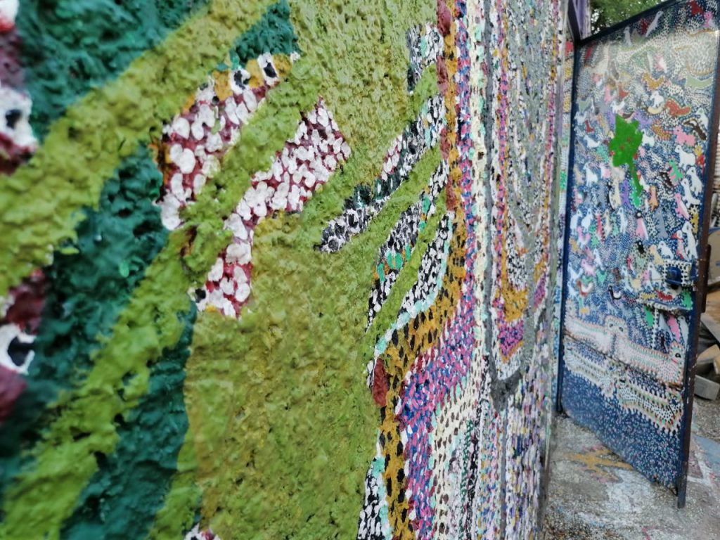 تنوعت الأدوات التي استخدمها أبو خليل في إنتاج هذا الحائط الفني؛ ما بين الحصى الصغيرة المعروفة بالكنكري، وقطع الرخام المكسّرة، وأغطية العلب البلاستيكية، وخرز المسابيح، والألوان الإضافية، وبعض الإضافات الجمالية الطبيعية، أو ممّا شراهُ من الأسواق، وما قام بابتكاره بنفسه، أو بما يفيضُ من حاجياتهِ معيدًا تدويرها، وقبل ذلك كلّه ريشتهُ التي يضربُ بها نقوشهُ المختلفة.