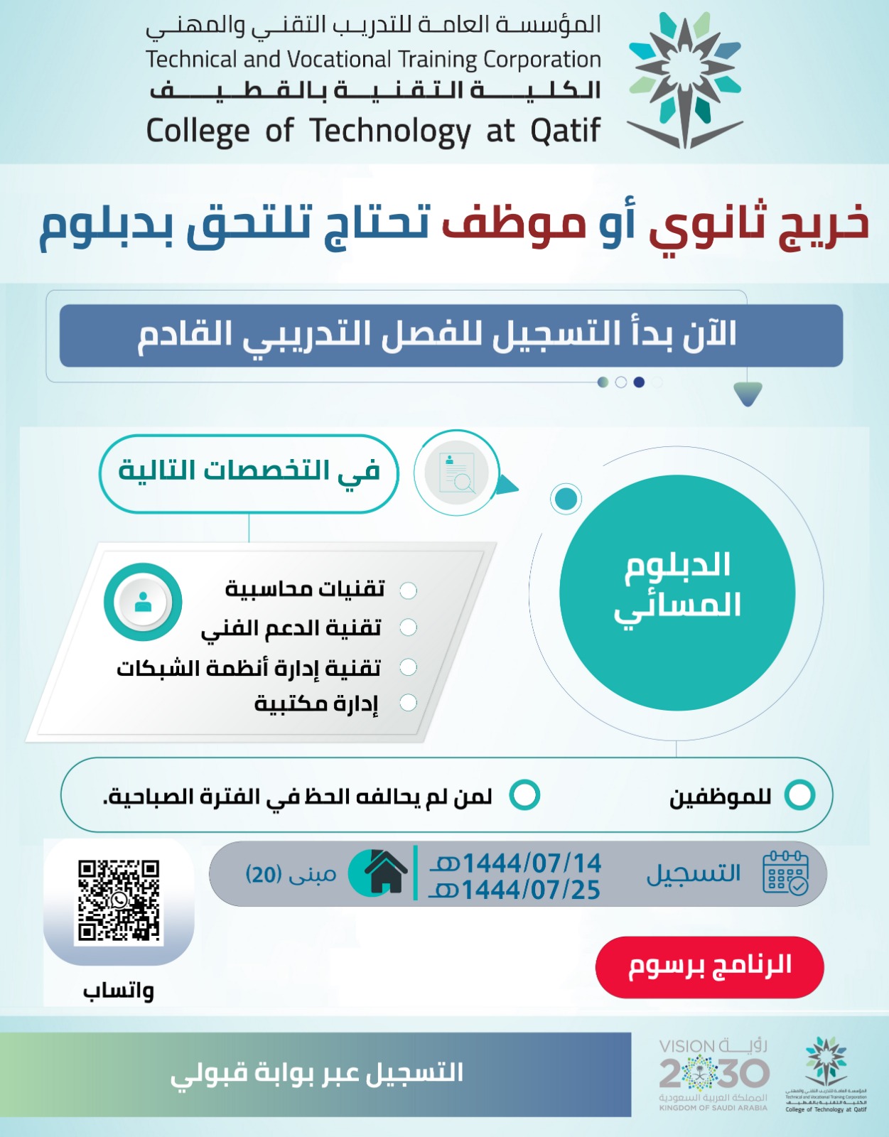 تعلن الكلية التقنية بالقطيف، بالتعاون مع المؤسسـة العامـة للتدريب التقني والمهنـي، عن فتح باب القبول في الدبلوم المسائي للفصل التدريبي القادم عبر بوابة قبولي.