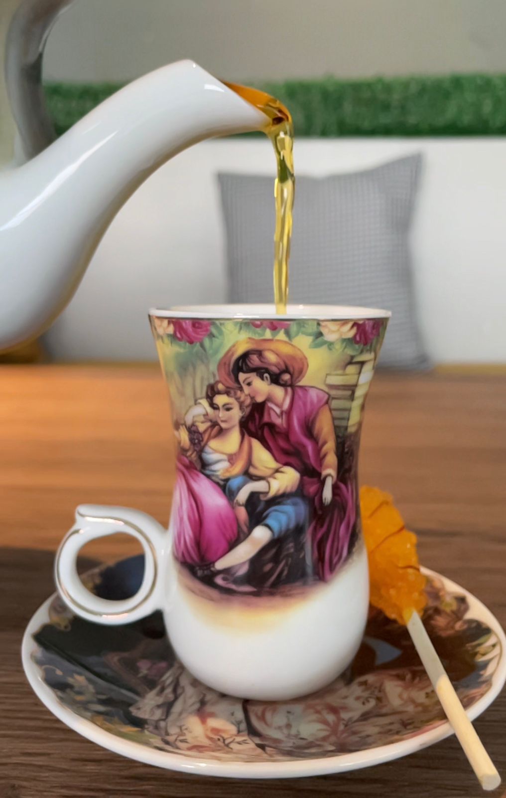 المطعم يقدم الأكلات الإيرانية والشاي الإيراني بالمستكة وكيكة الزعفران والفلوجة والباستنا الإيرانية