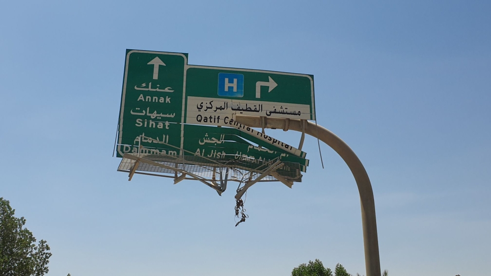 وتحولت اللوحة إلى كومة من الحديد المعلق والتي يُخشى من سقوطها أو سقوط أجزاء وقطع منها على إحدى المركبات التي تمر على الشارع ذاته، علمًا بأن هذه اللوحة تشير إلى الاتجاه لمستشفى القطيف المركزي والجش وعنك وسيهات.