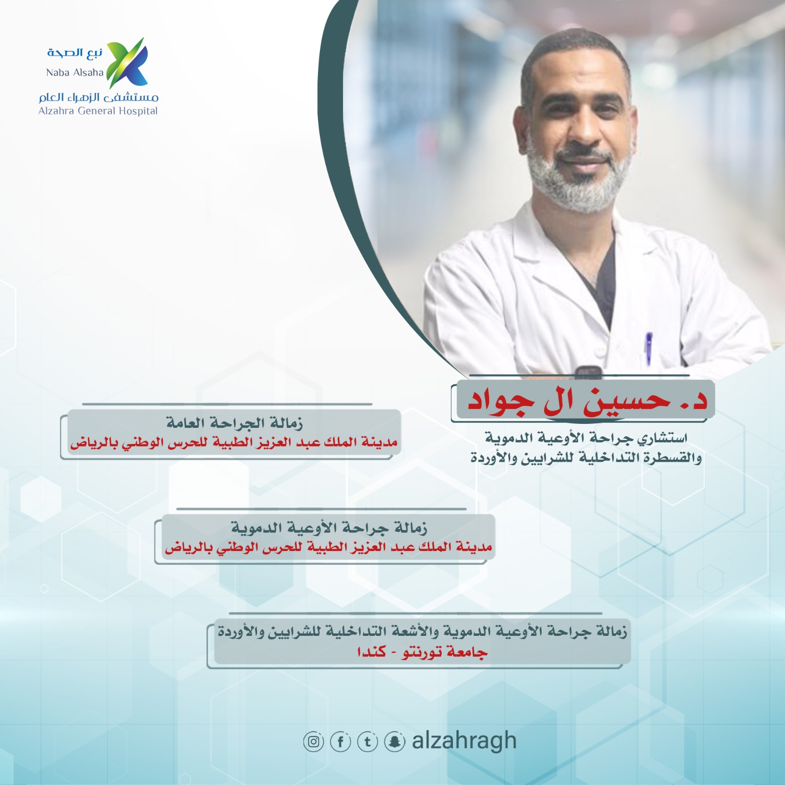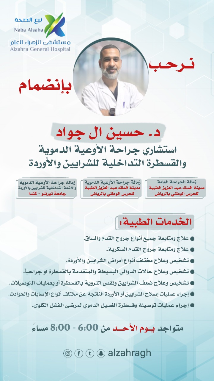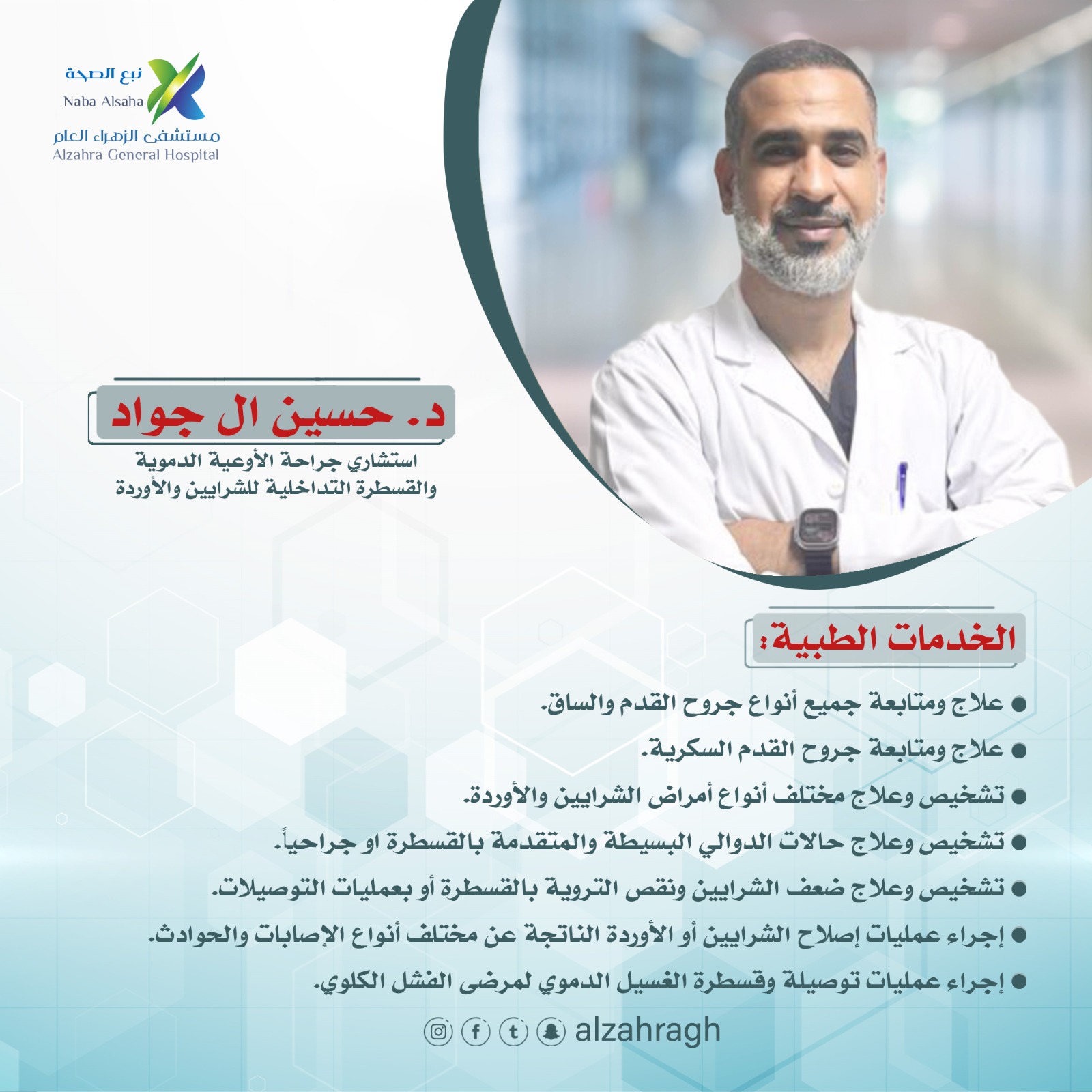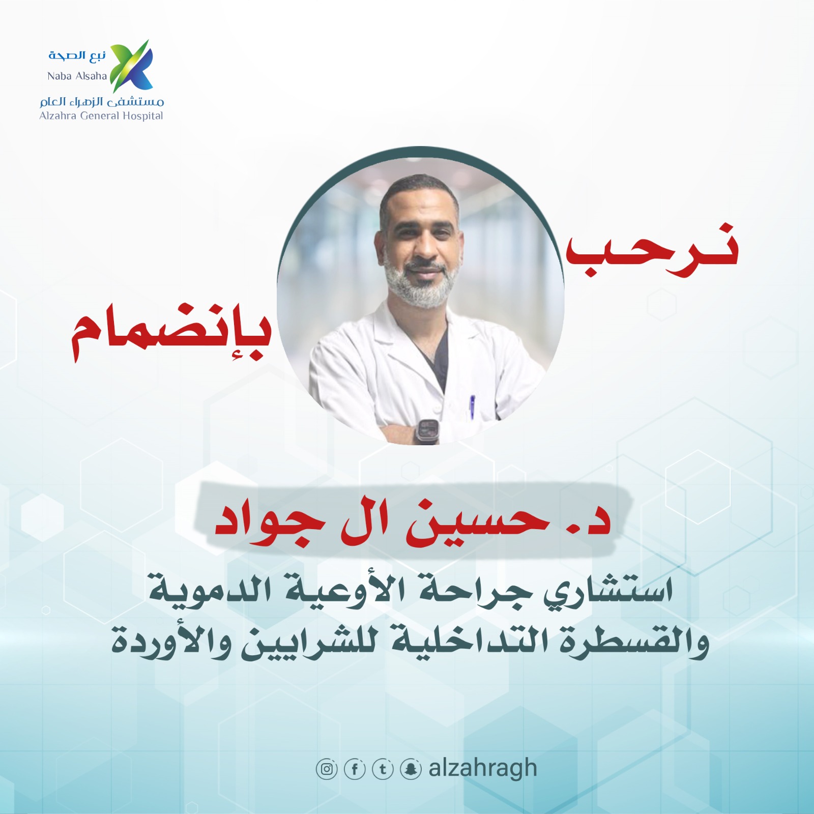 يسر مستشفى الزهراء العام أن يُعلن عن إنضمام استشاري جراحة الأوعية الدموية والقسطرة التداخلية للشرايين والأوردة الدكتور حسين ال جواد إلى فريقه الطبي.