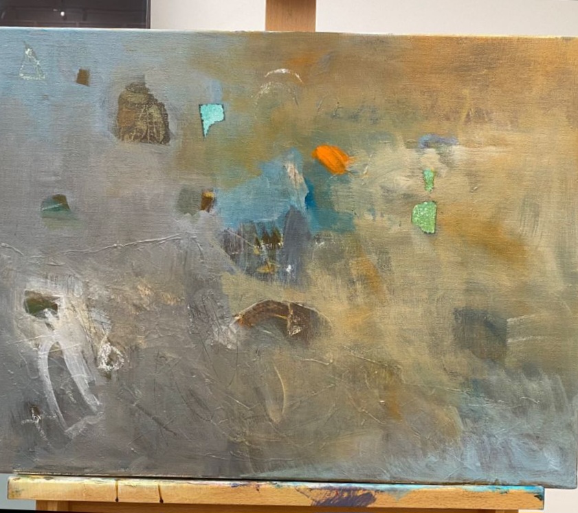 ووضع بين أيديهم نبذة عن الأدوات الفنية واستخداماتها، معززًا الورشة بلوحة تجريدية أنجزها خلال حديثه مع شرح الخطوات والتعليق عليها.