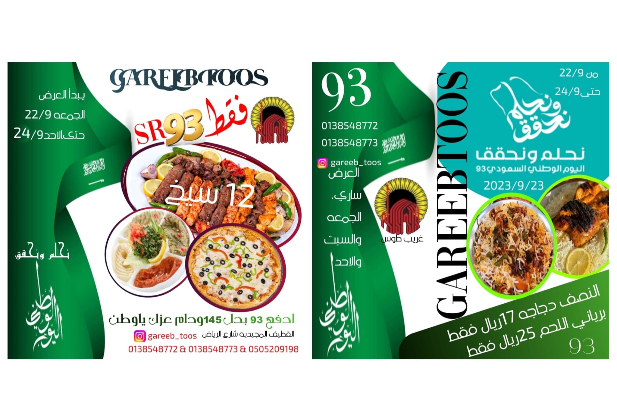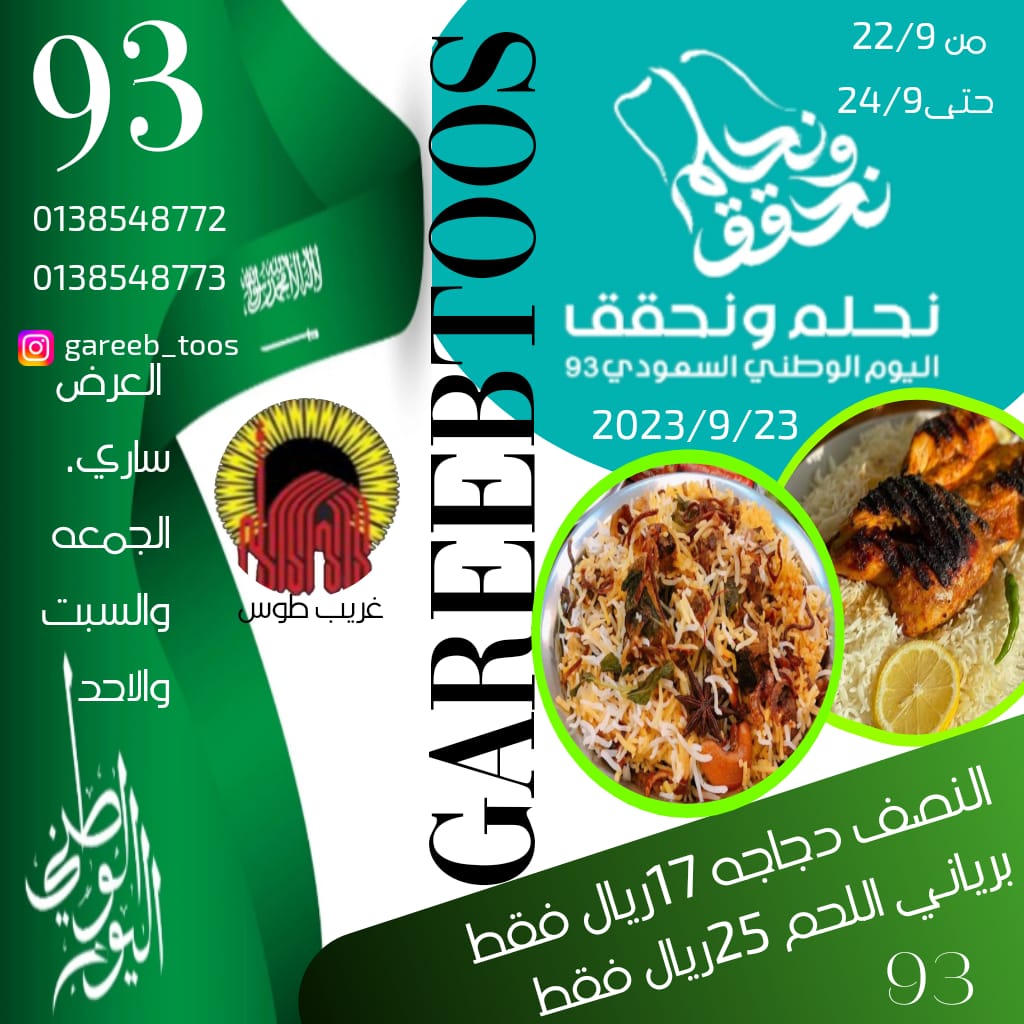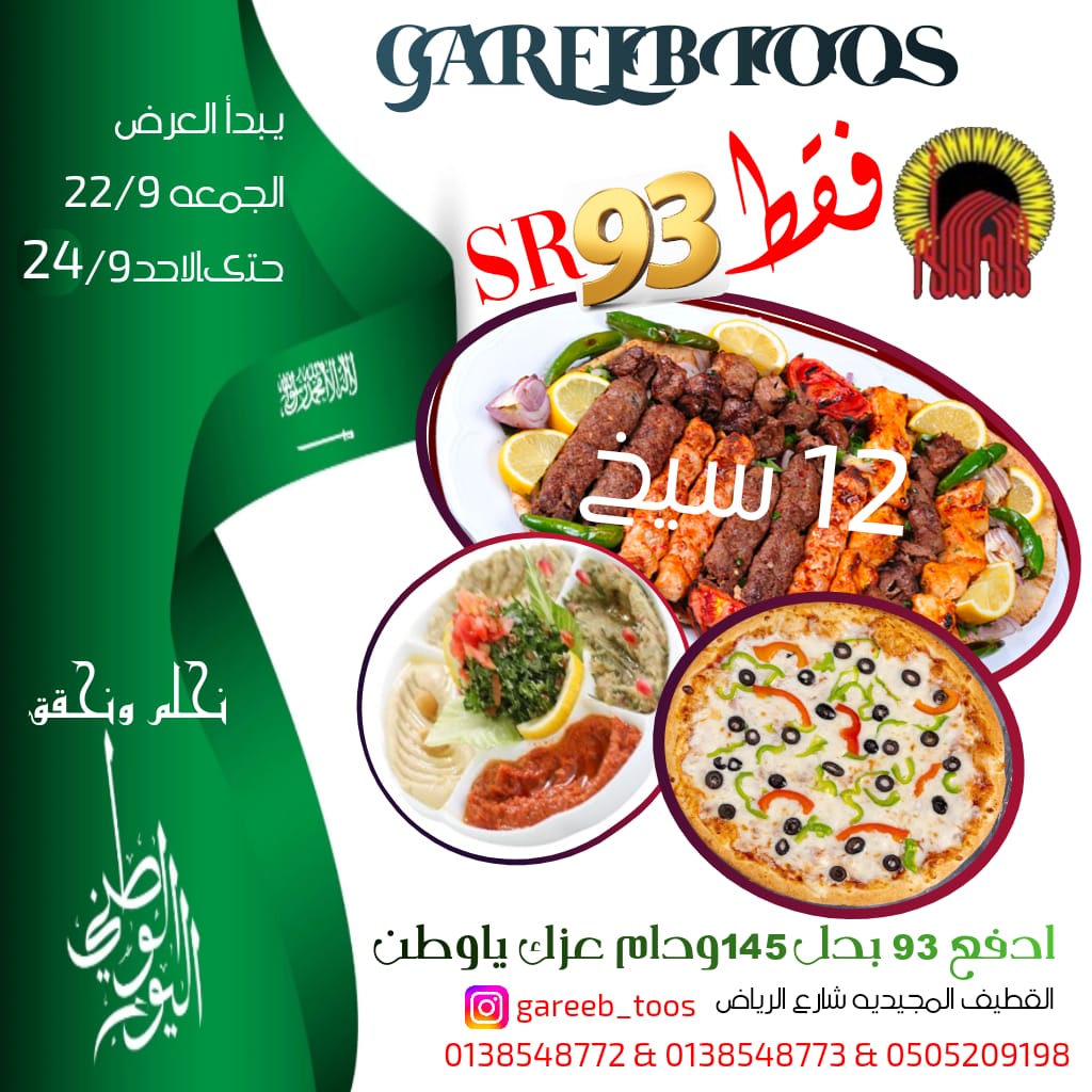 عروض مطعم غريب طوس للغداء والعشاء بمناسبة اليوم الوطني السعودي 🇸🇦🇸🇦🇸🇦