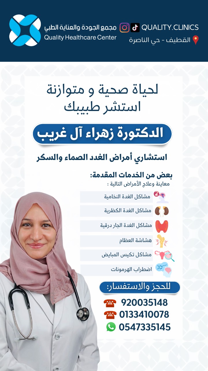 لحياة صحية ومتوازنة استشر الدكتورة زهراء آل غريب في مجمع الجودة و العناية الطبي.