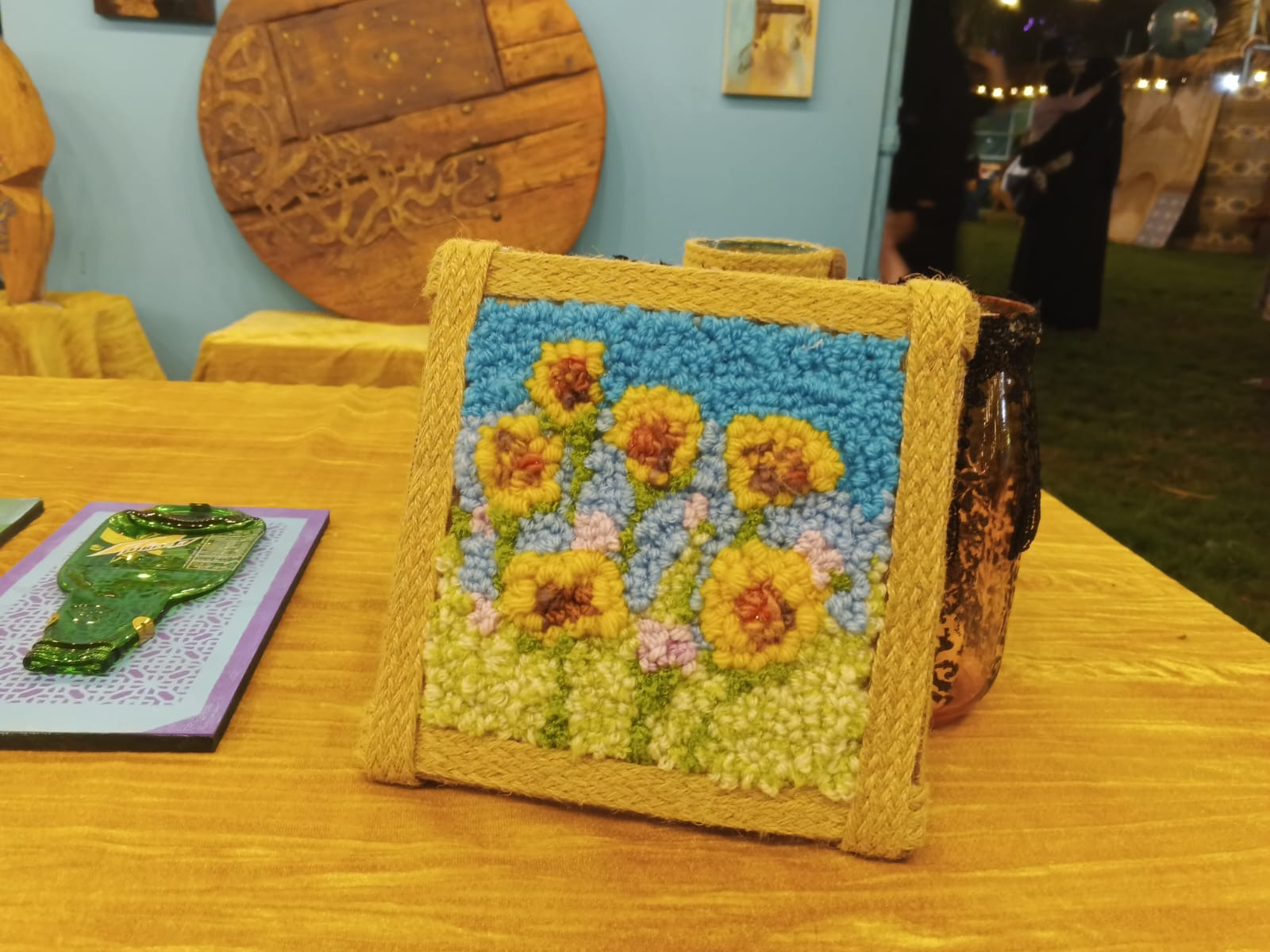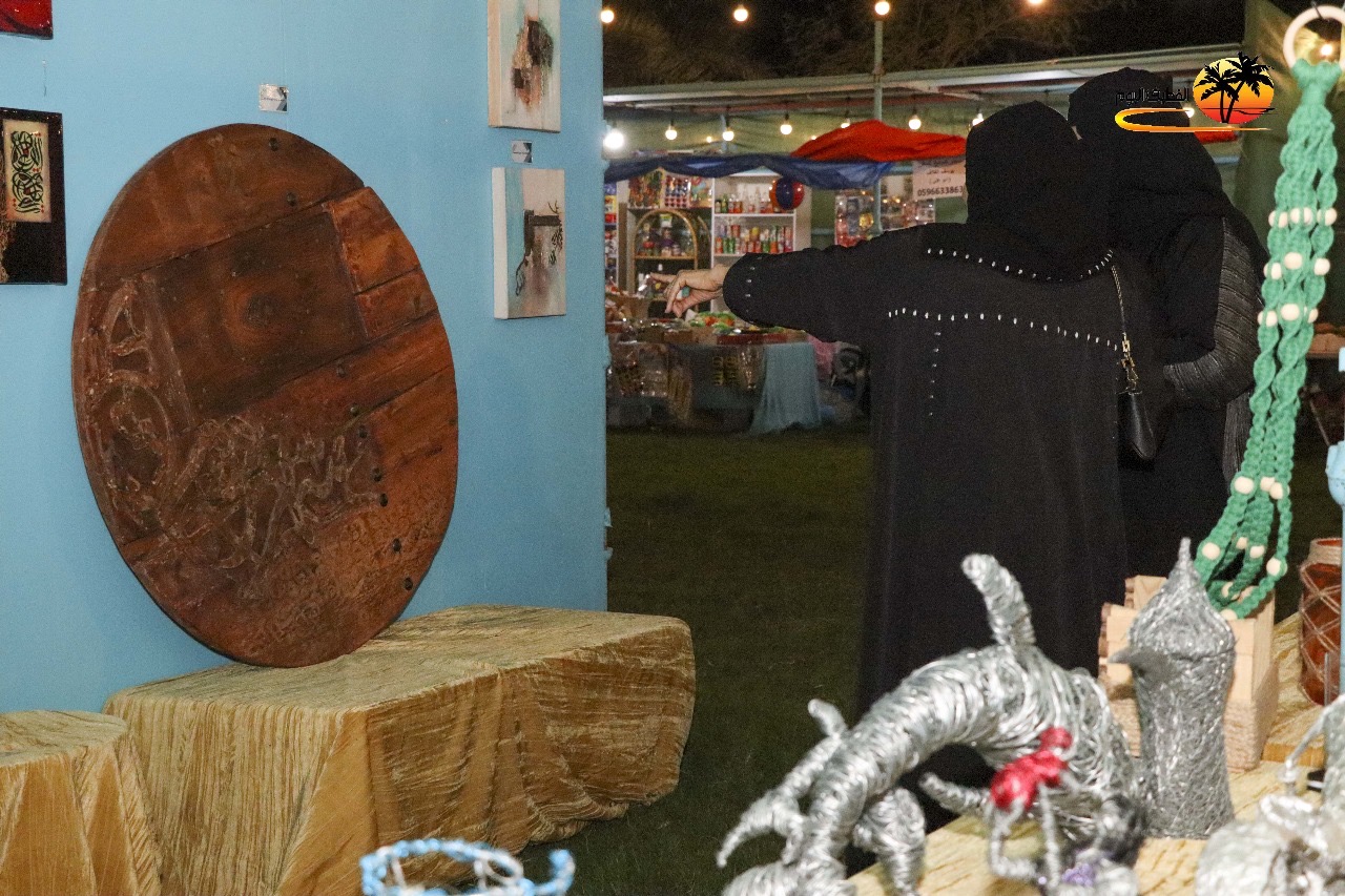 وأوضحت مسؤولة البرامج بجمعية العطاء دلال العوامي أن المعرض المقام في المهرجان ضم مشغولات فنية وظَّف فيها الفنانون خامات وقطعًا بيئية بإعادة تدويرها وجعلها قطعًا فنية، وكذلك لوحات استخدمت فيها قطع الجرائد لتصنيع فن الكولاج، وقطع مجسمات فنية مصنوعة من علاقات الملابس، وأعمال فنية مصنعة من صناديق الخضراوات، وكذلك إعادة تدوير الحاويات بأشكال وأحجام لجعلها شمعدانات، ومجموعة أعمال فنية مصنوعة من كراتين وقصاصات ورقية، وكذلك لوحات فنية مصنوعة من تشكيل الزجاج المكسر والمعالج بالتسخين، وطاولة مصنوعة من جذع النخلة بعد المعالجة والتعديل بشكل جمالي، وجهاز الزراعة المائية بتوظيف قوارير الماء.
