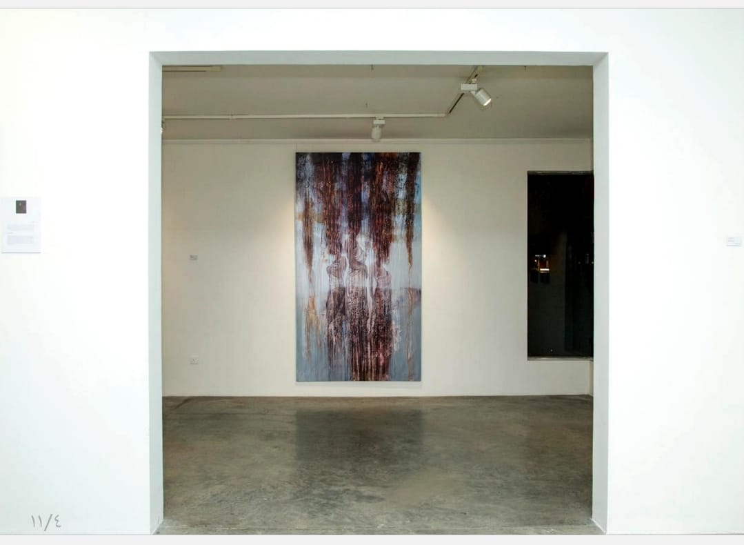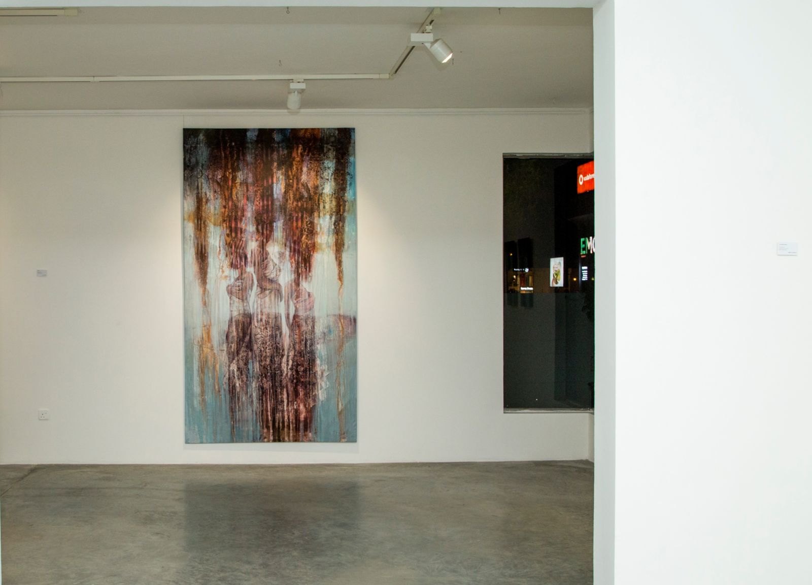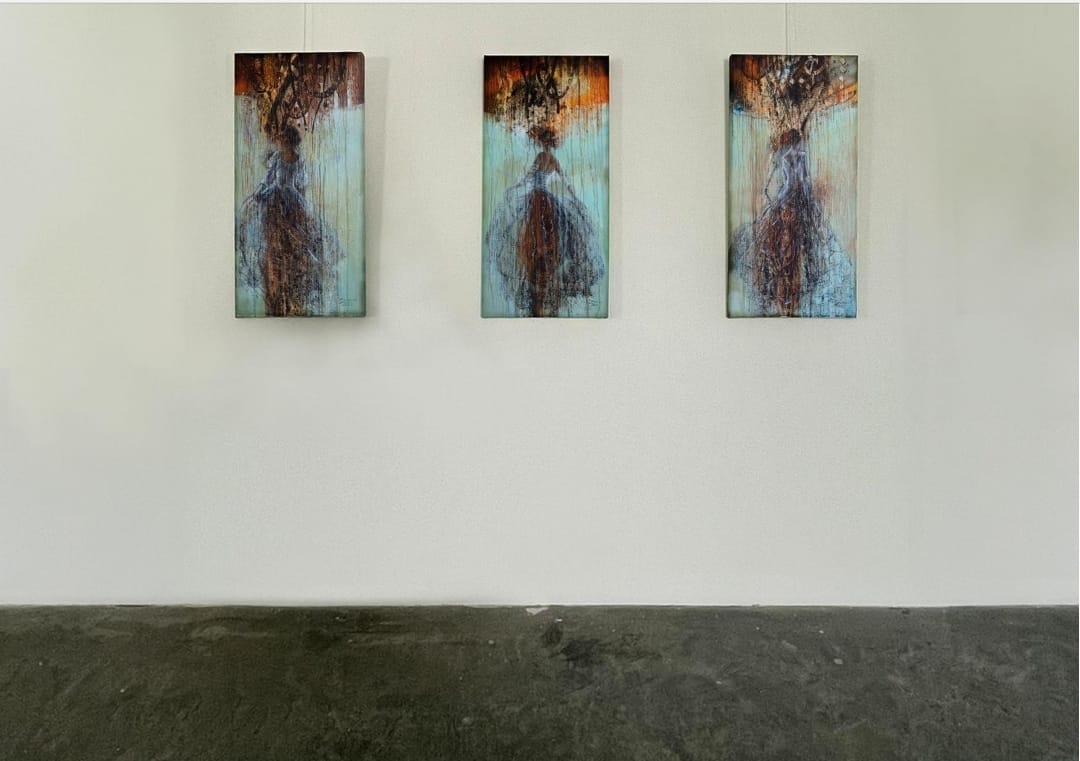 وأضاف: "هذا الظهور المتعمد يأتي ضمن سياق التجربة والتأكيدات، حيث إن بقايا انسياب اللون الذي ينزل على شكل غيمة علوية ماطرة تتشكل من خلالها مجموعة خطوط وألوان منسابة بشكل عفوي تخلق مجموعة من الكتل يتم تأكيدها لاحقًا للتحول لأجساد أنثوية انسيابية راقصة سواء على شكل مفردة أو جمع، والتي لا تعني أحدًا بينما يمكن أن تعني جميع من لا يلامس نفسه فيها".