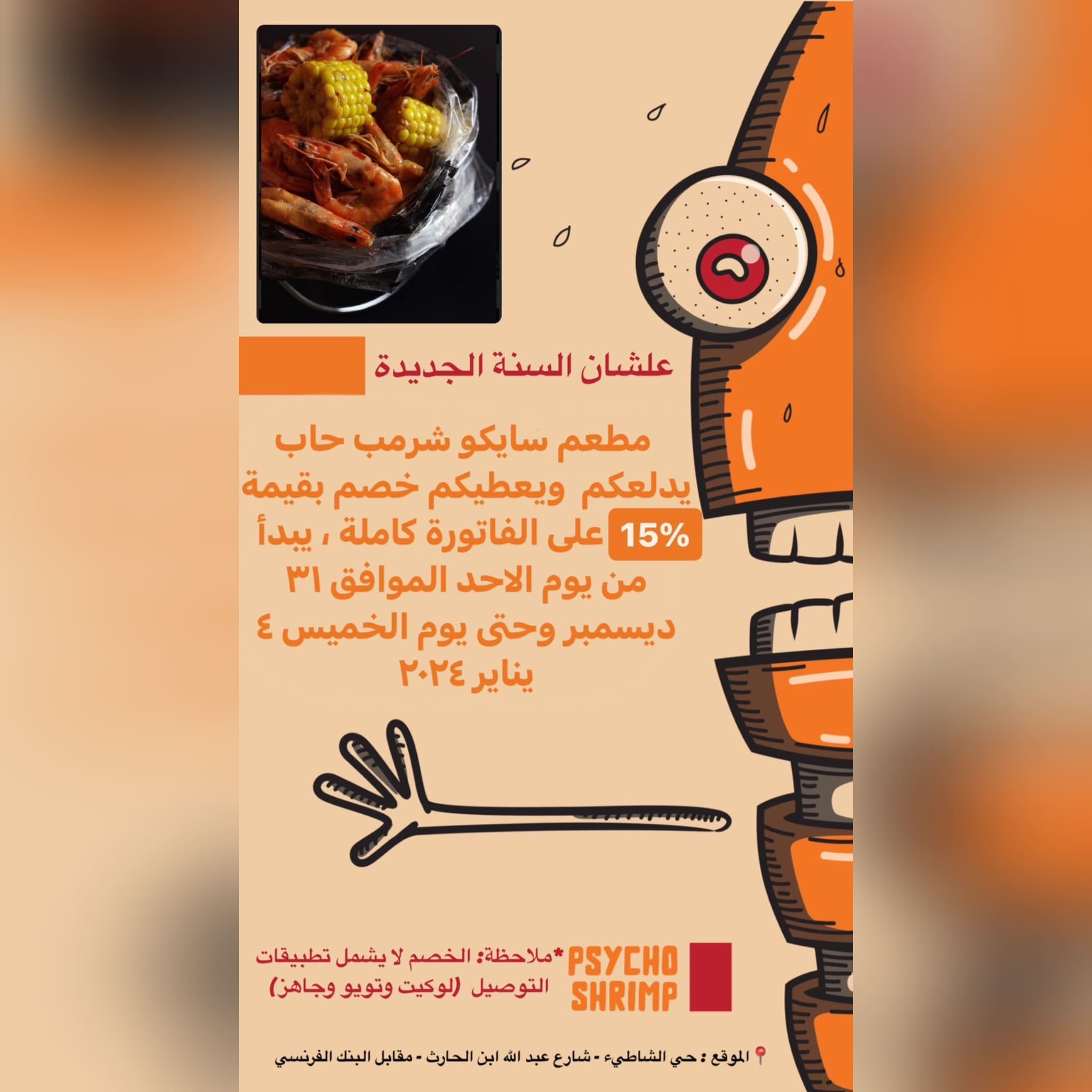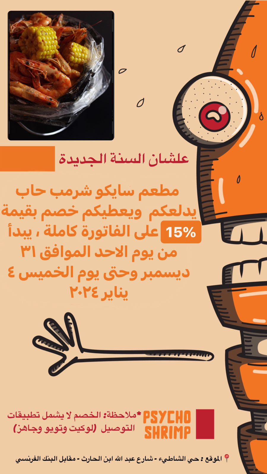مطعم سايكو شرمب حاب يدلعكم ويعطيكم خصم بقيمة ١٥٪ على الفاتورة كاملة ، يبدأ من يوم الاحد الموافق ٣١ ديسمبر الى يوم الخميس ٤ يناير ٢٠٢٤.