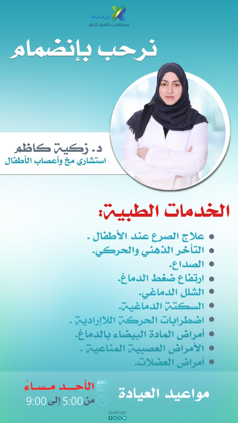 يعلن «مستشفى الزهراء العام» بالقطيف عن انضمام: الدكتورة/ زكية كاظم