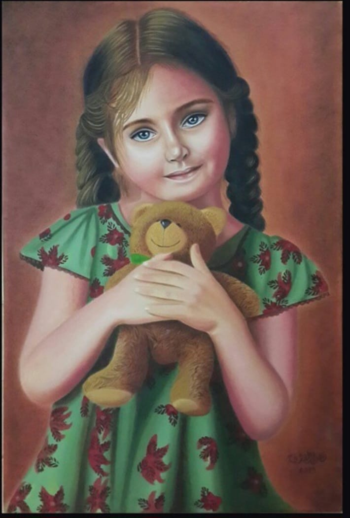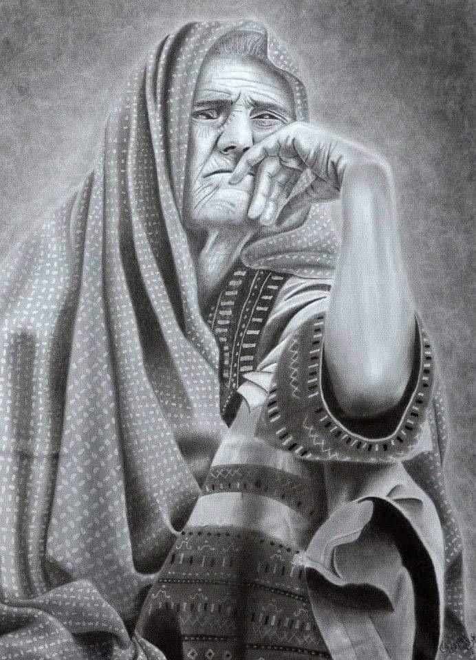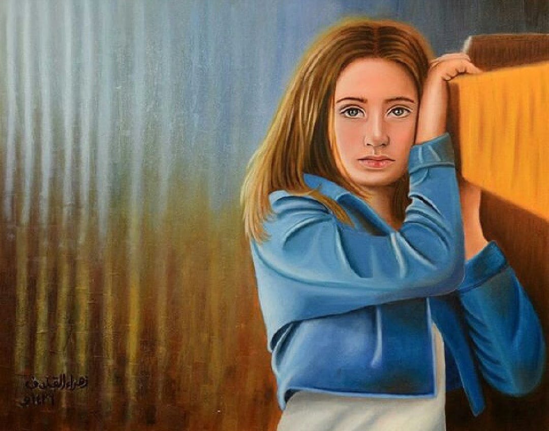 وعملت فيها على إبراز روح النقاء والصفاء بنظراتٍ لها ألف معنى، فهي ليست مجرد بورتريه لرسم وجه بطريقة أقرب إلى الواقع -كما وصفتها- وإنما بإمكان المتذوق أن يرى المشاعر التي تحملها بلونيها الأبيض والأسود كقصة كامنة وراء اللوحة.