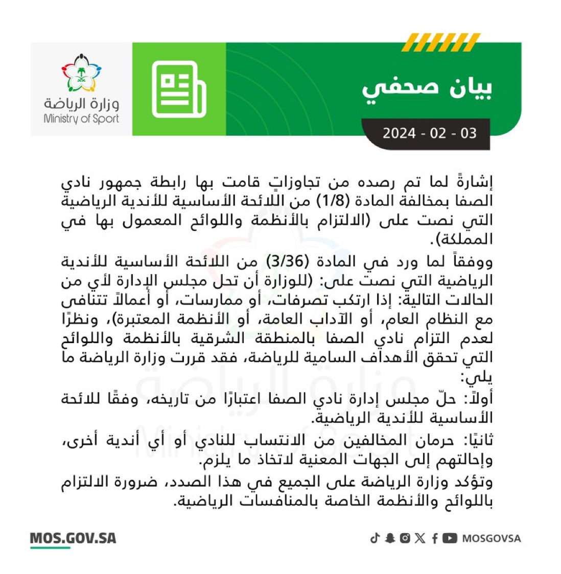 إشارة لما تم رصده من تجاوزات قامت بها رابطة جمهور نادي الصفا بمخالفة المادة (1/8) من اللائحة الأساسية للأندية الرياضية التي نصت على (الالتزام بالأنظمة واللوائح المعمول بها في المملكة). ووفقًا لما ورد في المادة (3/36) من اللائحة الأساسية للأندية الرياضية التي نصت على: (للوزارة أن تحل مجلس الإدارة لأي من الحالات التالية: إذا ارتكب تصرفات أو ممارسات أو أعمالًا تتنافى مع النظام العام، أو الآداب العامة، أو الأنظمة المعتبرة)، ونظرًا لعدم التزام نادي الصفا بالمنطقة الشرقية بالأنظمة واللوائح التي تحقق الأهداف السامية للرياضة. فقد قررت وزارة الرياضة ما يلي: