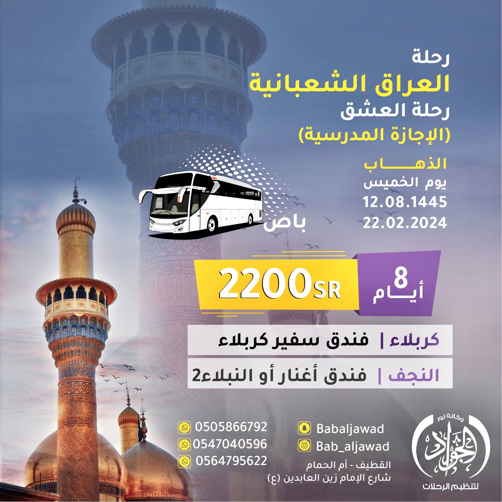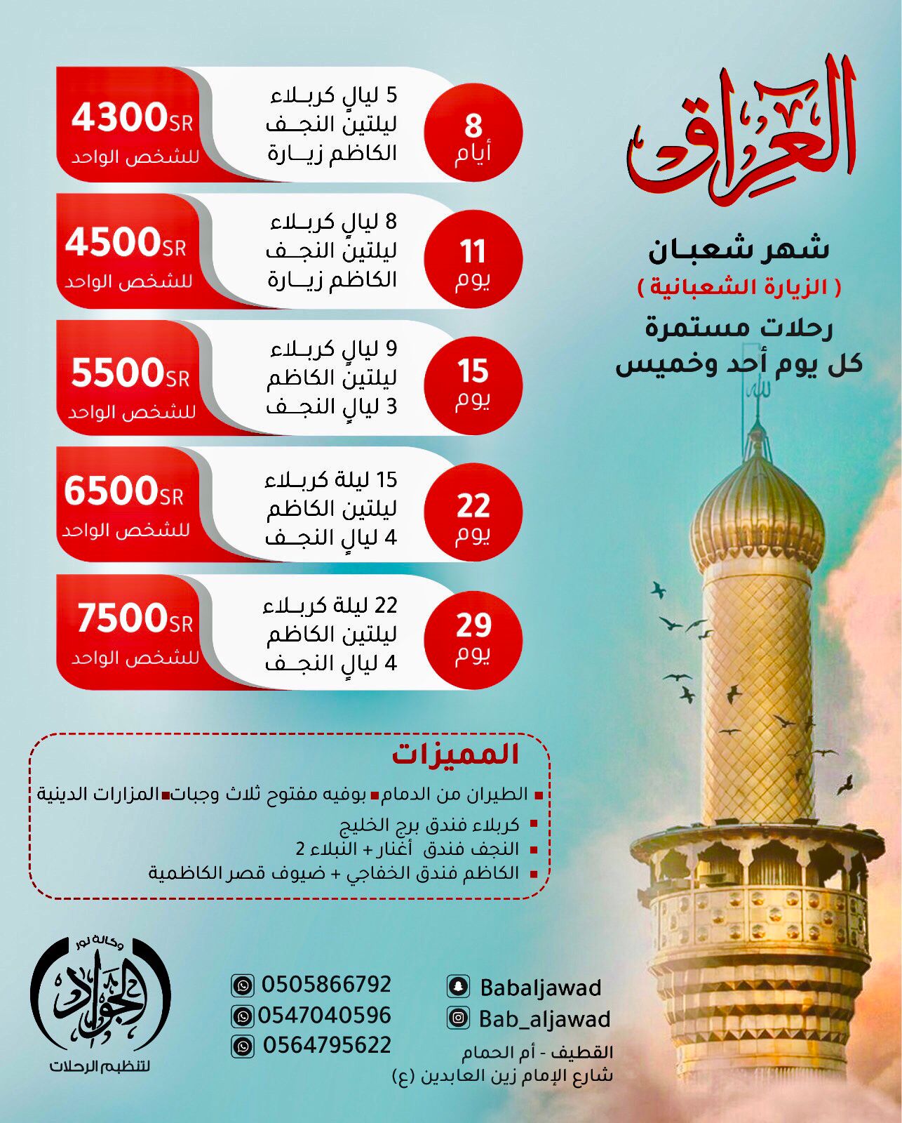 «وكالة نور الجواد لتنظيم الرحلات» تقدم برنامج رحلات العراق في شهر شعبان