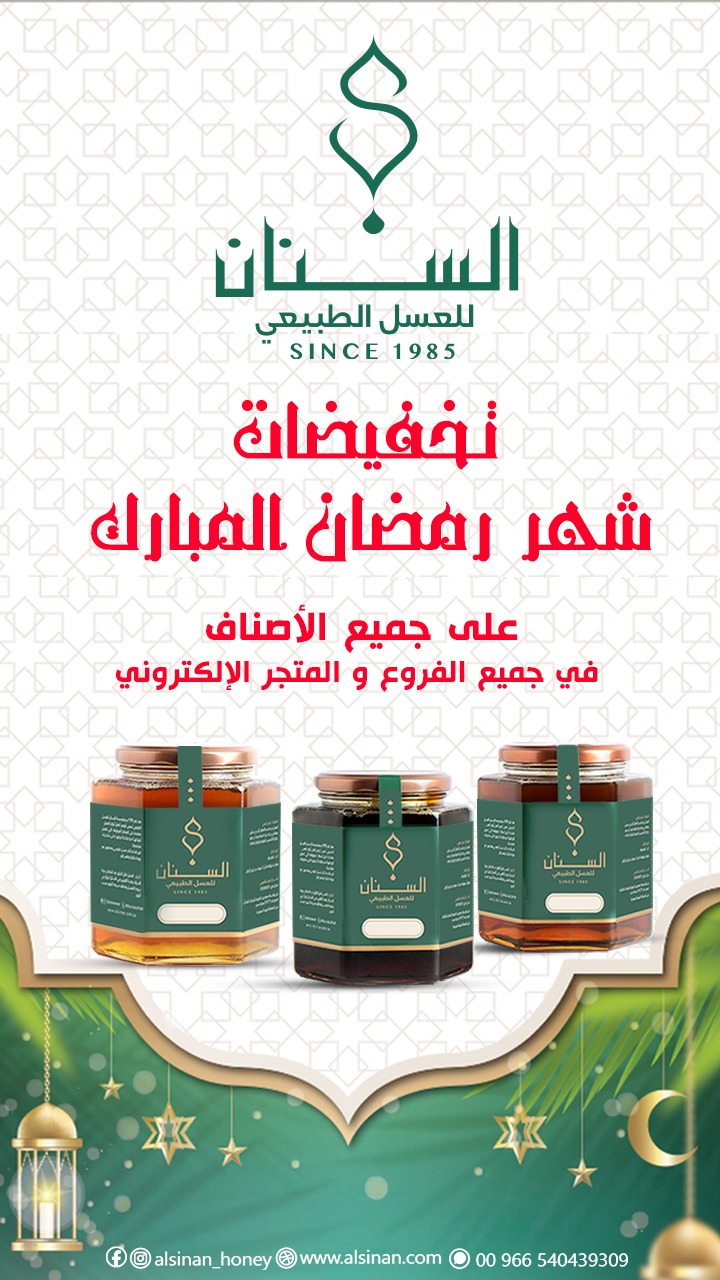 استمتع بتخفيضات شاملة على العسل الطبيعي خلال شهر رمضان المبارك! احصل على العسل الطبيعي بأسعار مميزة واستمتع بفوائده الصحية العديدة لتعزيز صحتك وجمالك هذا الشهر الفضيل.