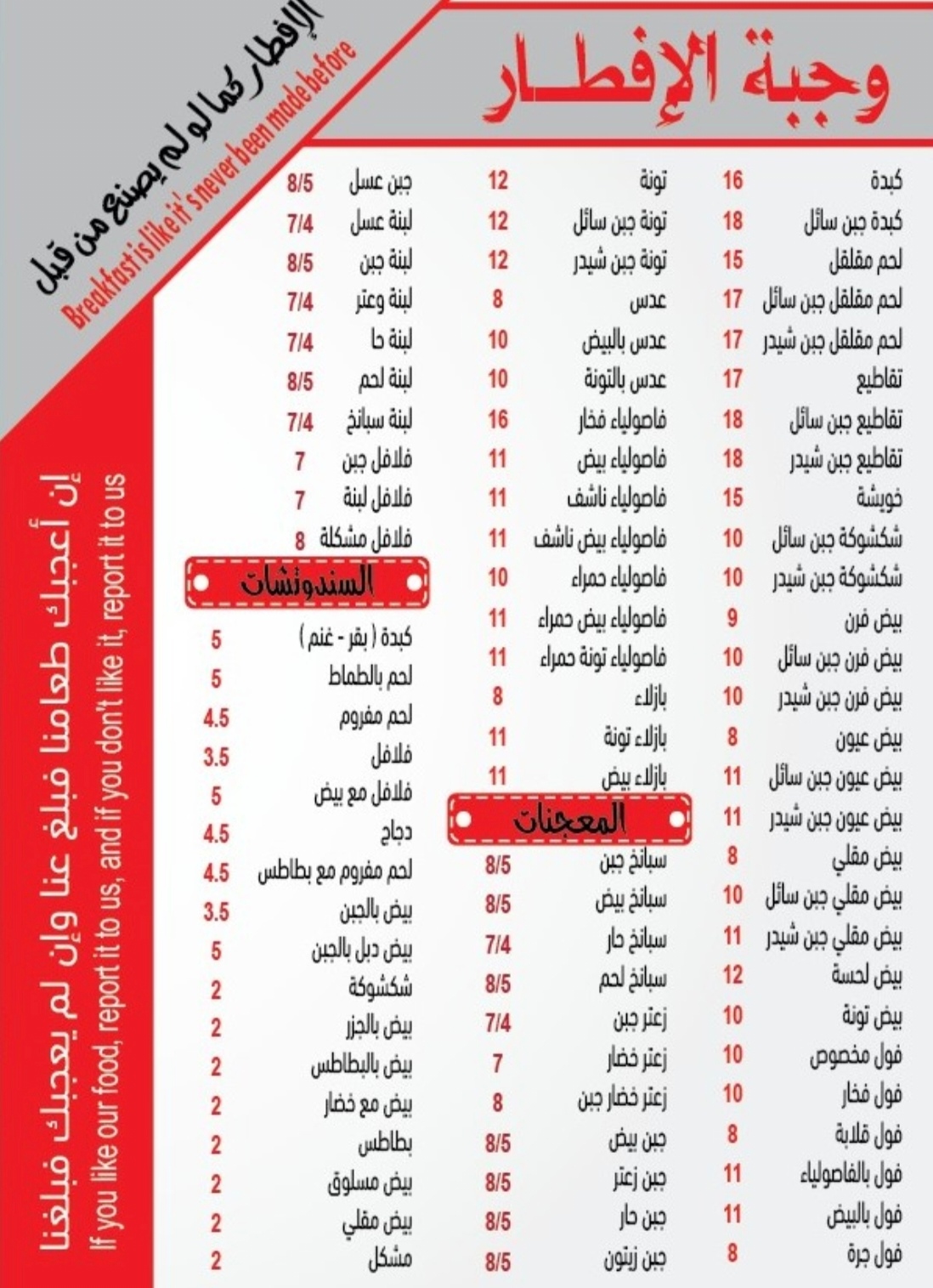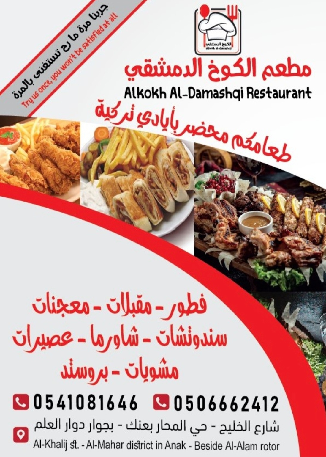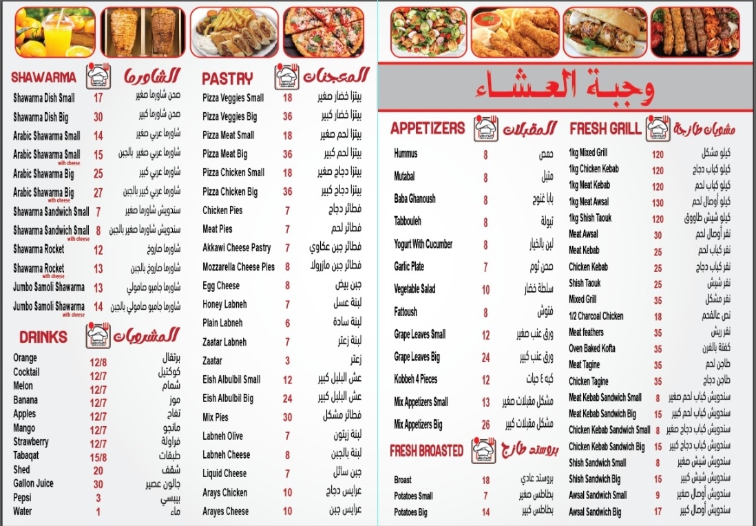 لدينا جميع المأكولات اليمنية (فول القلابة - العدس - كبدة الغنم الطازجة - كبدة الحاشي الطازجة وجميع الأطباق الشعبيه)والفلافل الشامية والمعجنات السورية والشامية بالإضافة لوجبة العشاء ( المشويات والشاورما والبروستد ) بأيدي تركية متخصصة 👌..