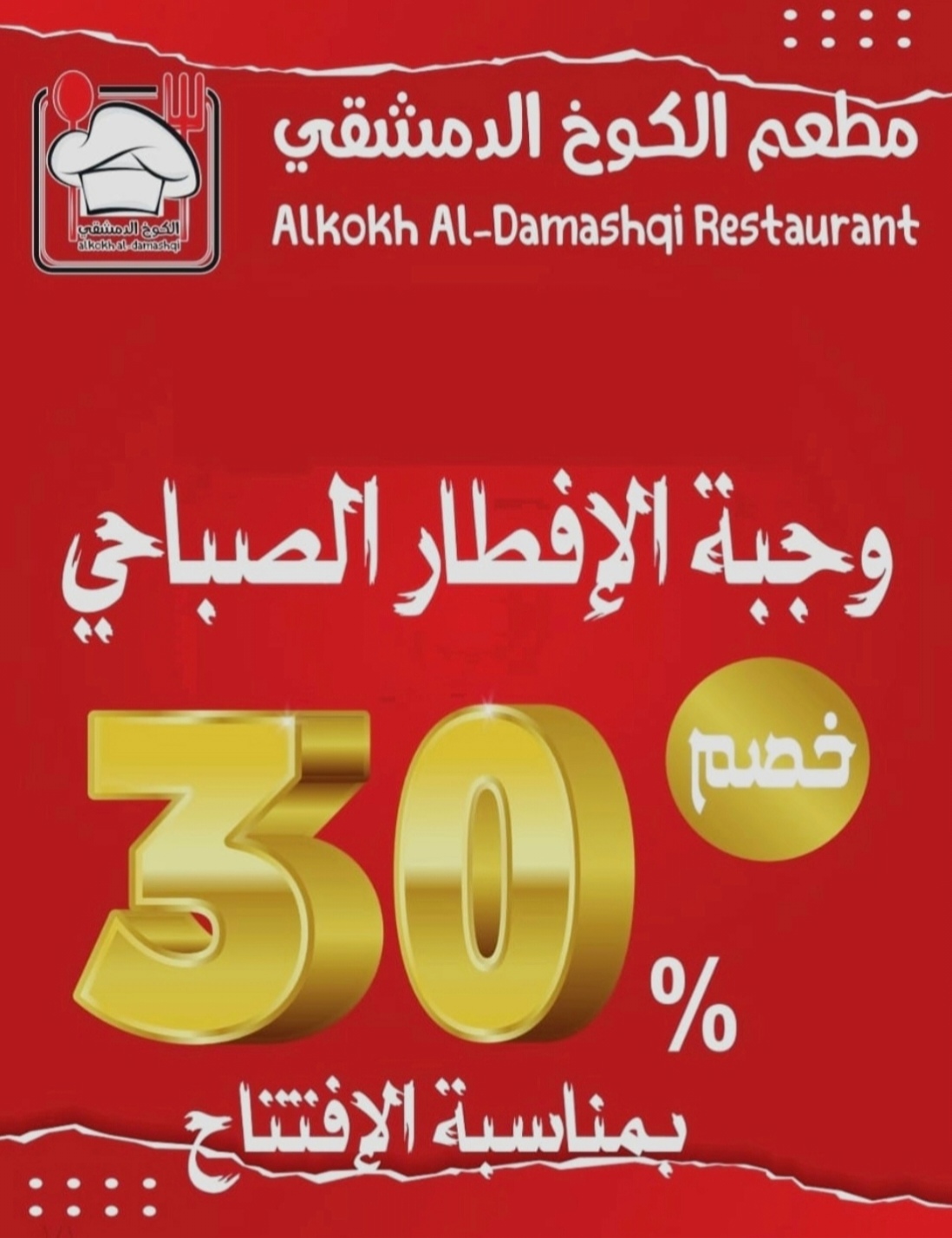 خصم 30% لمدة ثلاث أيام لوجبة الإفطار والعشاء بمناسبة افتتاح وجبة الافطار ..