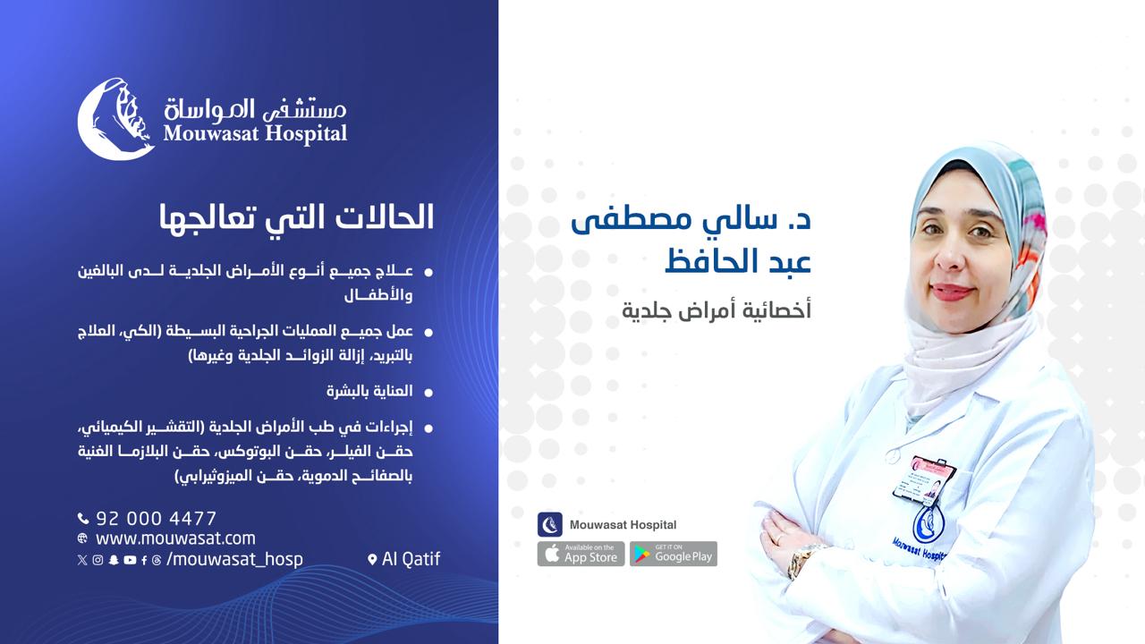 يسر مستشفى المواساة بالقطيف أن يعلن عن انضمام الدكتورة سالي مصطفى عبد الحافظ أخصائية الأمراض الجلدية إلى طاقمه الطبي.
