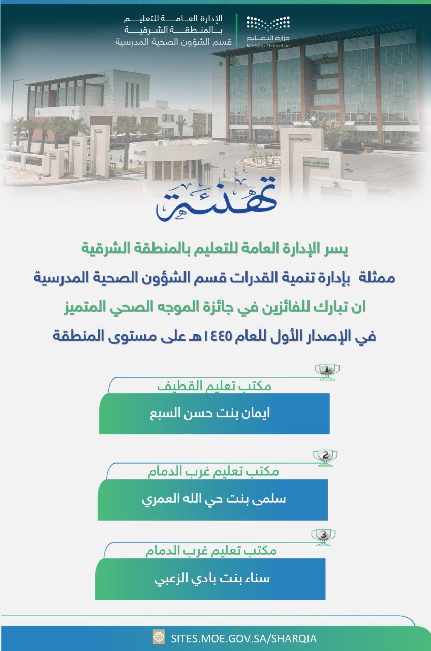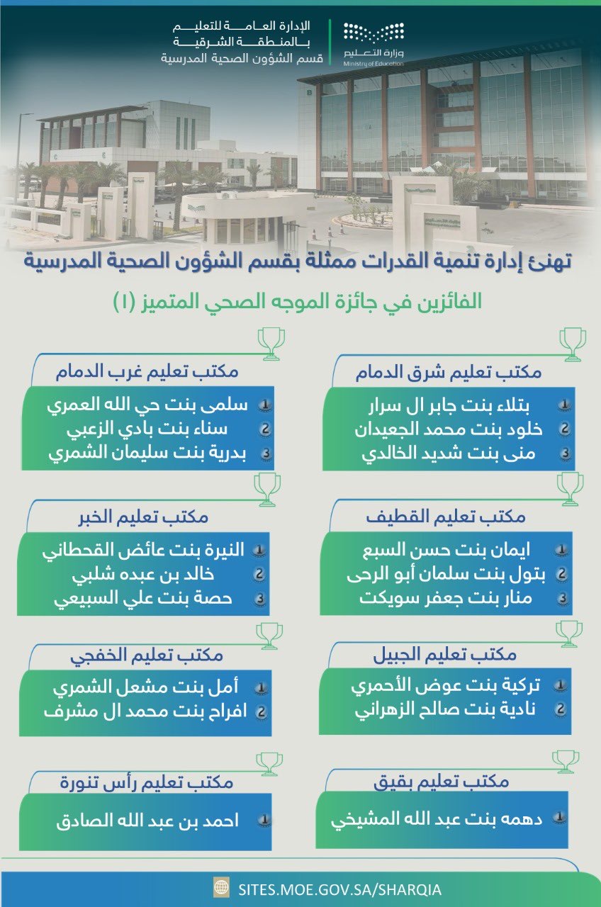 أعلنت الإدارة العامة للتعليم بالمنطقة الشرقية أسماء الفائزين بجائزة الموجه الصحي المتميز (الإصدار الأول) للعام 1445هـ، على مستوى مكاتب تعليم المنطقة، وعلى مستوى المنطقة.