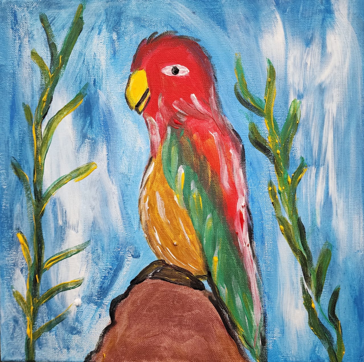 وجسدت في اللوحة الأولى طائر الببغاء الذي يتميز بريش متعدد الألوان وزاهٍ، وفي اللوحة الثانية تجسد فتاة يبدو على وجهها المرح والسعادة وترتدي فستانًا أحمر.