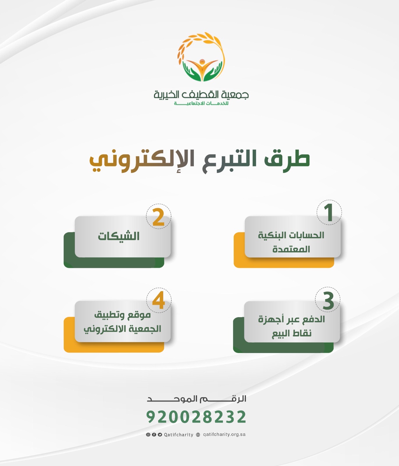ودعت الجمعية الراغبين في معرفة المزيد حول وسائل الدفع الإلكتروني المتاحة للصدقات والتبرع للمشاريع والمبادرات التي تعمل عليها، إلى التواصل عبر الهاتف الموحد "920028232" أو زيارة الموقع الإلكتروني: qatifcharity.org.sa.