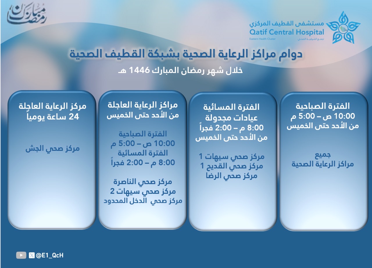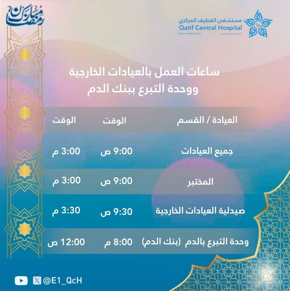 أعلن مستشفى القطيف المركزي عن مواعيد عمل العيادات الخارجية ومواعيد الزيارة ومواعيد عمل المراكز الصحية، خلال شهر رمضان المبارك لعام 1446هـ.