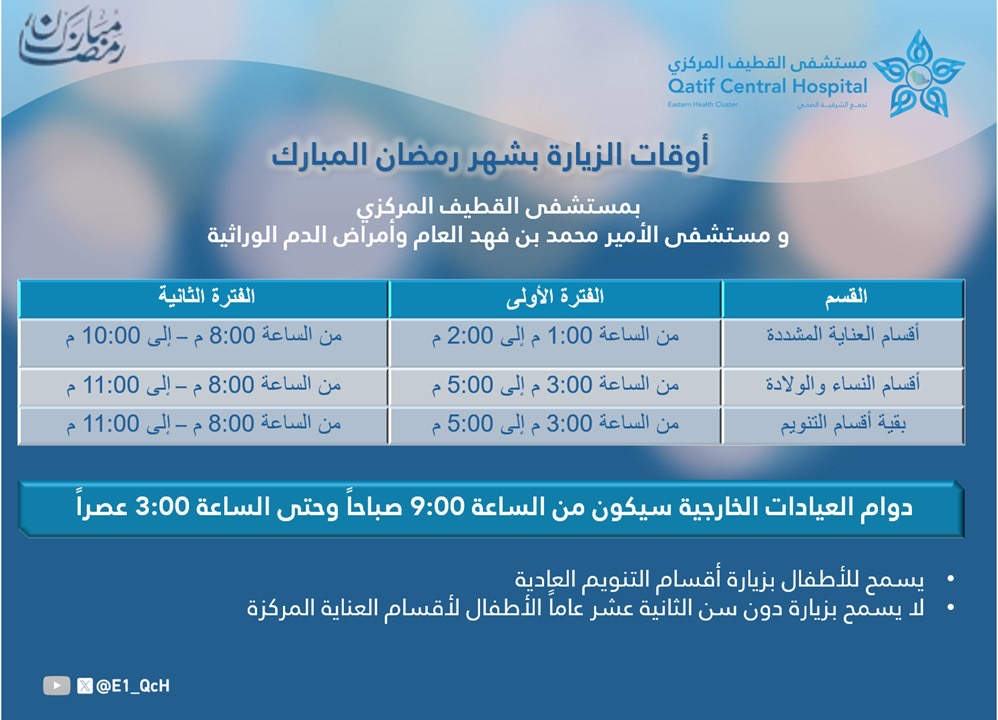 ولفت إلى أن أوقات الزيارة في شهر رمضان المبارك بمستشفى القطيف المركزي ومستشفى الأمير محمد بن فهد العام وأمراض الدم الوراثية، في أقسام العناية المشددة في الفترة الأولى من الساعة 1:00 مساءً إلى 2:00 مساءً، وفي الفترة الثانية من الساعة 8:00 مساءً إلى 10:00 مساء. وفي أقسام النساء والولادة في الفترة الأولى من الساعة 3:00 مساءً إلى 5:00 مساءً، وفي الفترة الثانية من الساعة 8:00 مساءً إلى 11:00 مساءً. وفي بقية أقسام التنويم في الفترة الأولى من الساعة 3:00 مساءً إلى 5:00 مساءً، وفي الفترة الثانية من الساعة 8:00 مساءً إلى 11:00 مساءً.