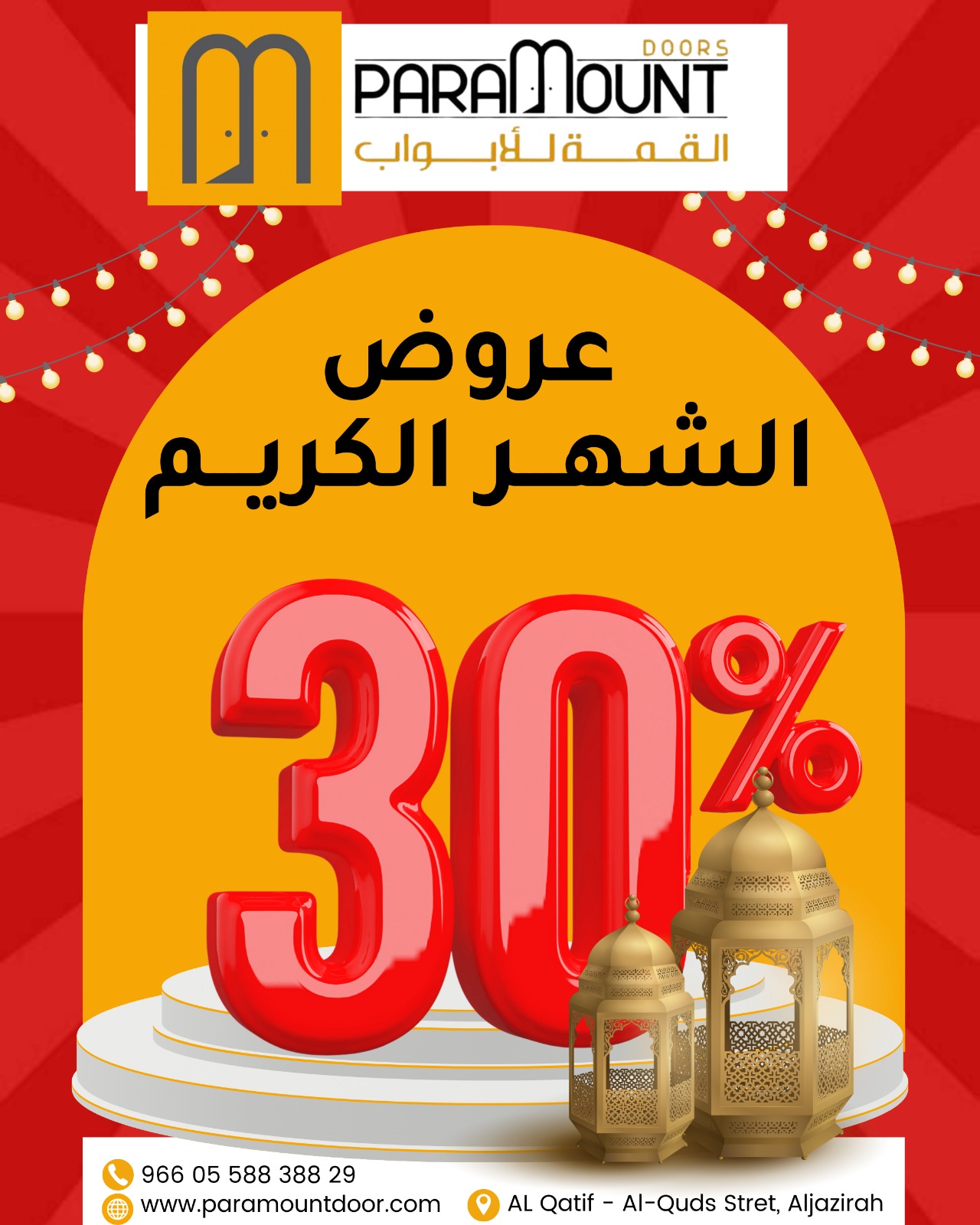 يسر شركة القمة للأبواب أن نقدم لكم أقوى خصومات 30% وأكثر بمناسبة الشهر الكريم.