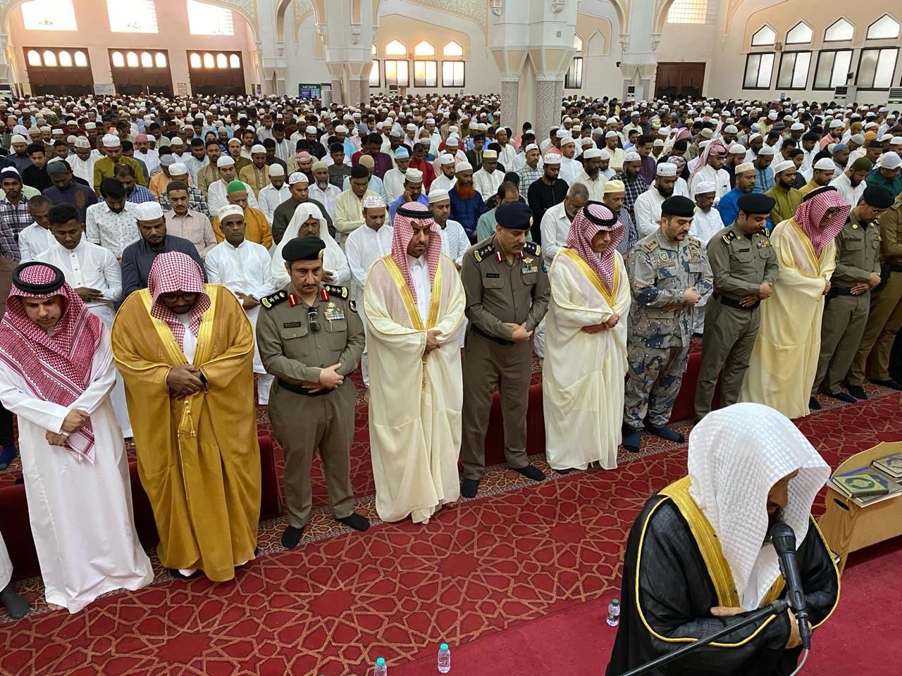 أدى جموع المصلين بمحافظة القطيف، صباح اليوم، صلاة عيد الفطر المبارك في جامع الإمام فيصل بن تركي، يتقدمهم محافظ القطيف إبراهيم بن محمد آل خريف.