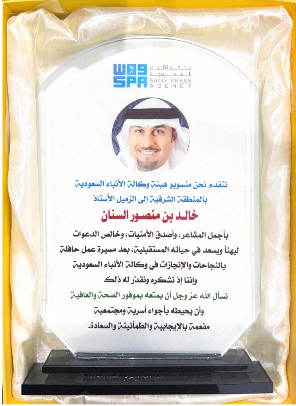كرّم مدير هيئة وكالة الأنباء السعودية بالمنطقة الشرقية علي حسن مشنوي، الإعلامي خالد بن منصور السنان، بحضور منسوبيه في مقر الهيئة بالدمام، وذلك نظير جهوده المميزة وعمله الدؤوب ودوره الفاعل في دعم مسيرة "واس" عبر رصد الفعاليات والبرامج والأنشطة لعدة سنوات.