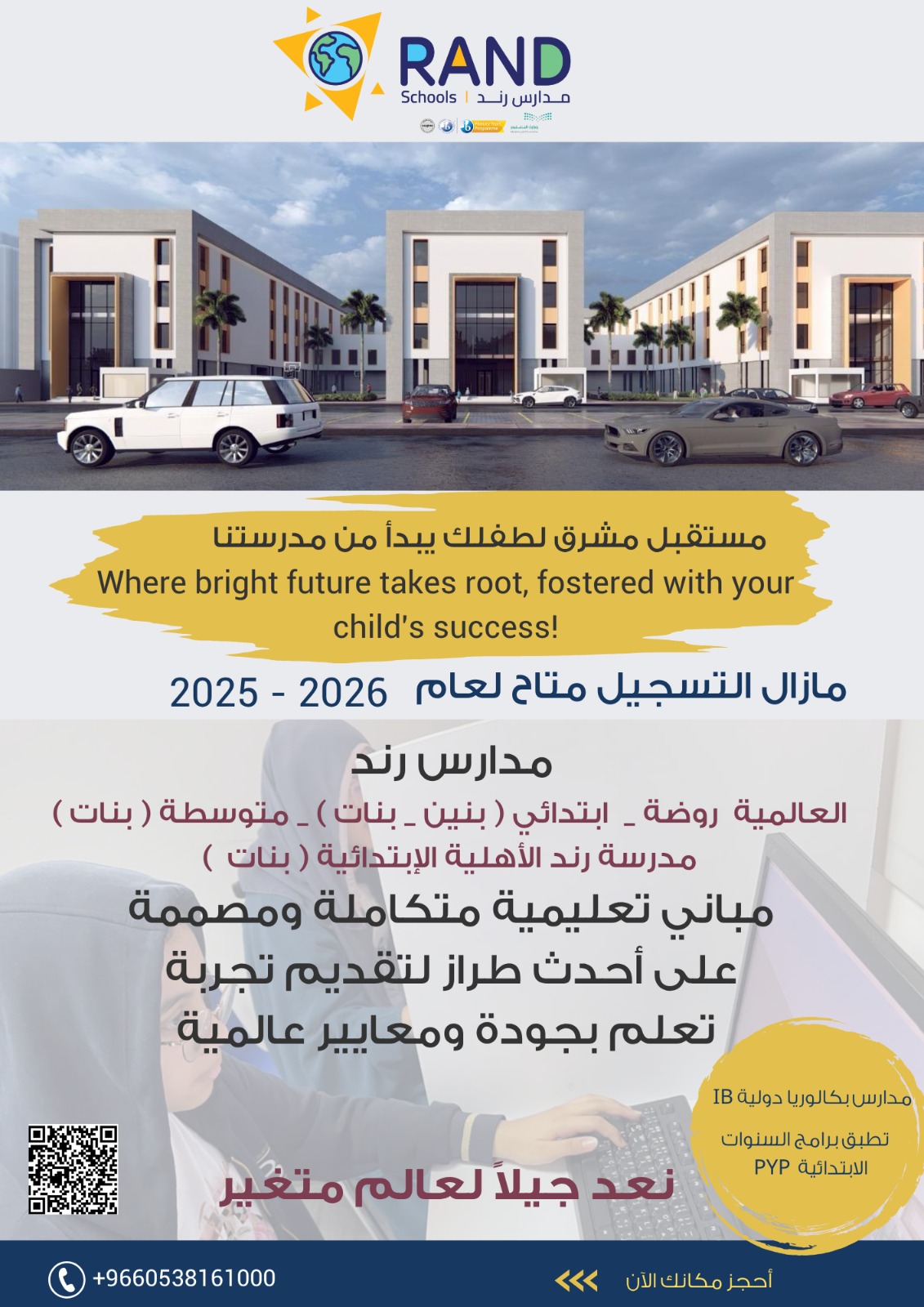 مدرسة رند الأهلية الابتدائية (بنات) مبانٍ تعليمية متكاملة ومصممة على أحدث طراز لتقديم تجربة تعلم بجودة ومعايير عالمية