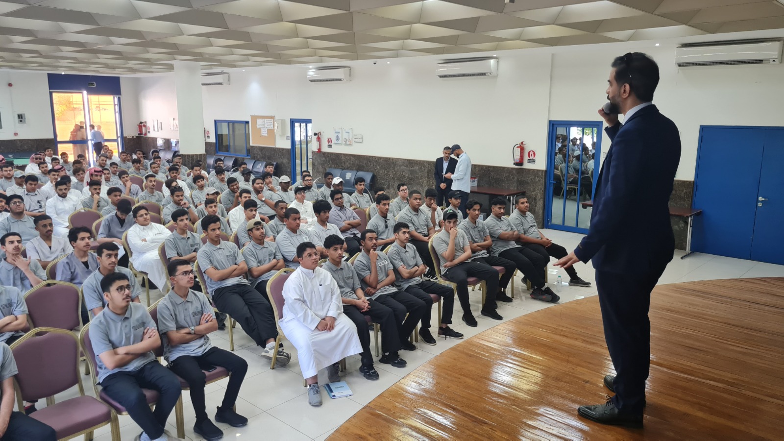 ثم قام وكيل شؤون المتدربين نايف السهلي بإلقاء كلمة توجيهية للمتدربين عرّفهم من خلالها باللوائح والأنظمة المتبعة في الكليات التقنية والتي يجب على جميع المتدربين معرفتها واتباعها حتى تكون مسيرتهم التدريبية في الكلية خالية من أي مشاكل أو عقبات .