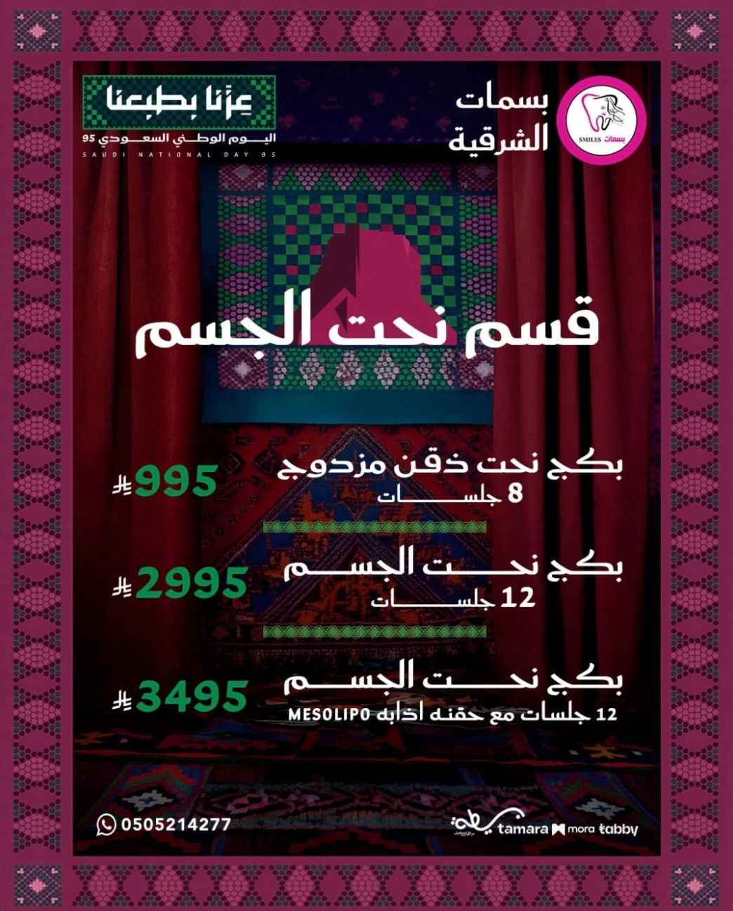 📢 استغل عرض اليوم الوطني وابدأ رحلتك نحو جسم مثالي مع أقوى عروض قسم نحت الجسم في مجمع بسمات الشرقية الطبي 🇸🇦