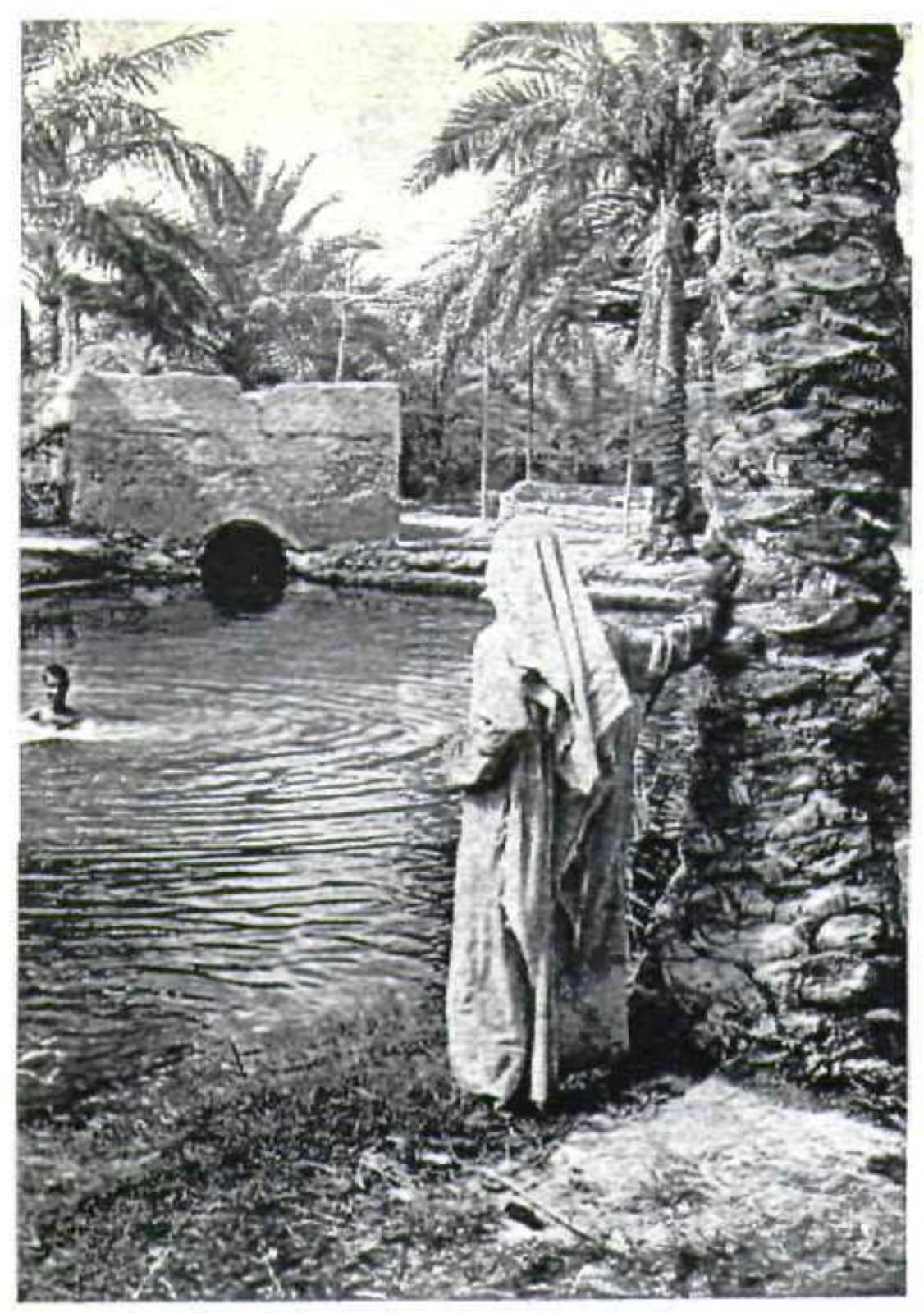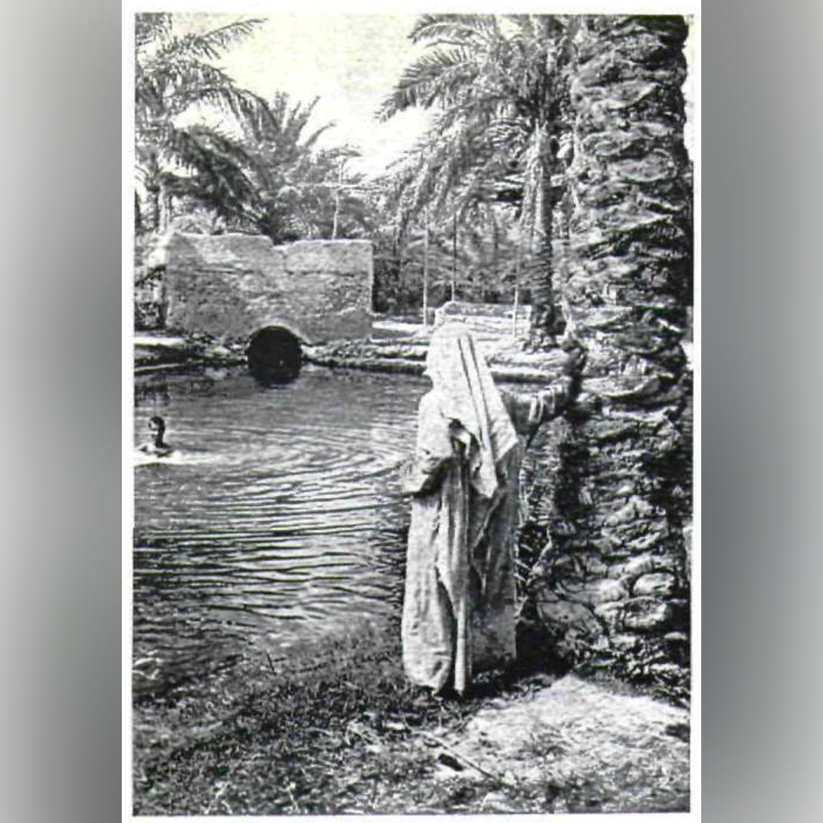 وتكشف الصورة مشهدًا طبيعيًا غارقًا في سكينة الواحة، حيث يقف أحد أبناء صفوى بثوبه التقليدي عند جذع نخلة باسقة، يتأمل تدفّق الماء من فتحة عين حجرية إلى حوض صغير تحيط به أشجار النخيل الوارفة، بينما يسبح طفل في المياه العذبة التي كانت آنذاك قلب الحياة اليومية لأهالي البلدة.