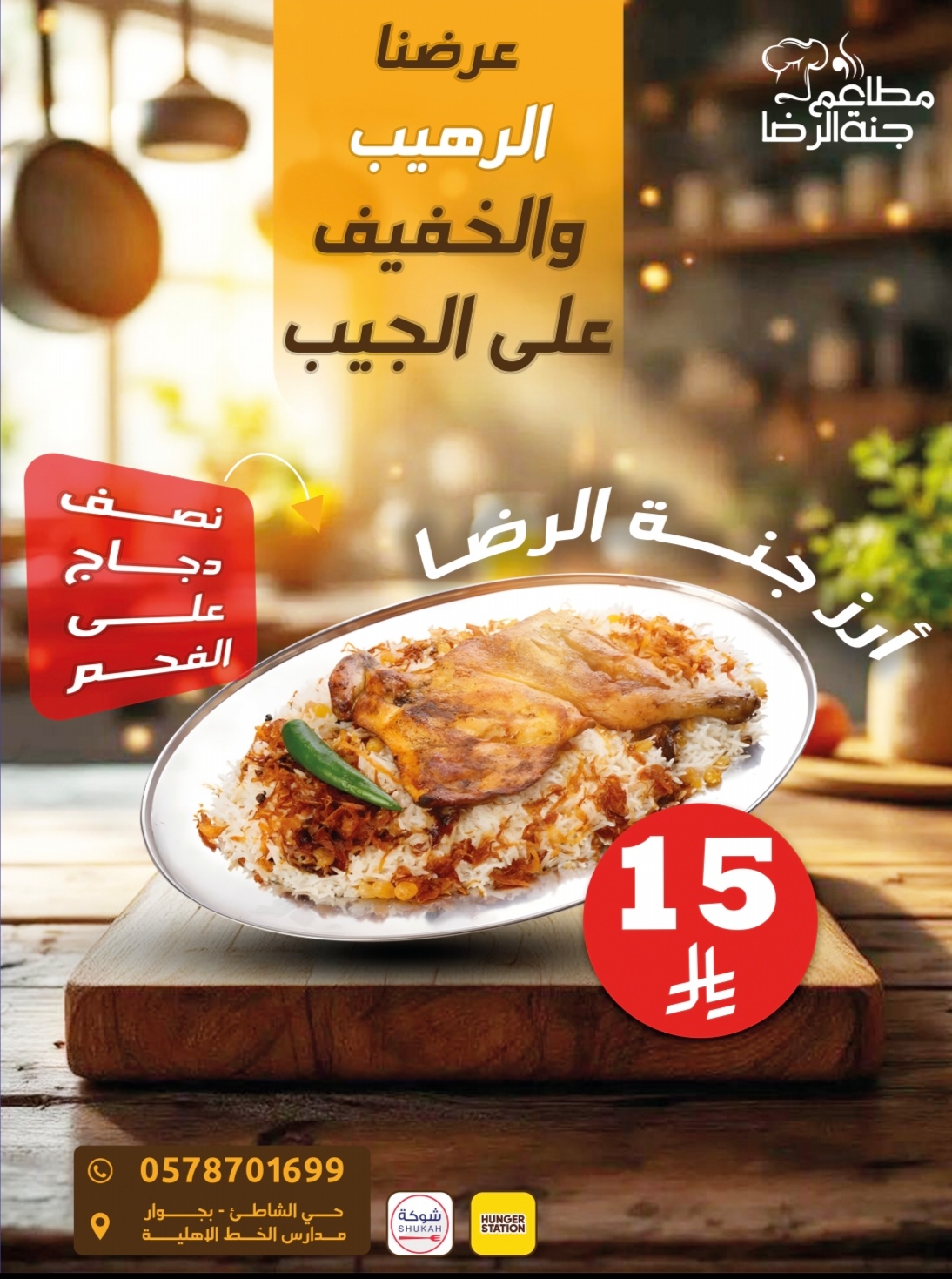 خلينا لكم العرض هالمرة على الدجاج على الفحم مع رز جنة الرضا فقط 15 ريال