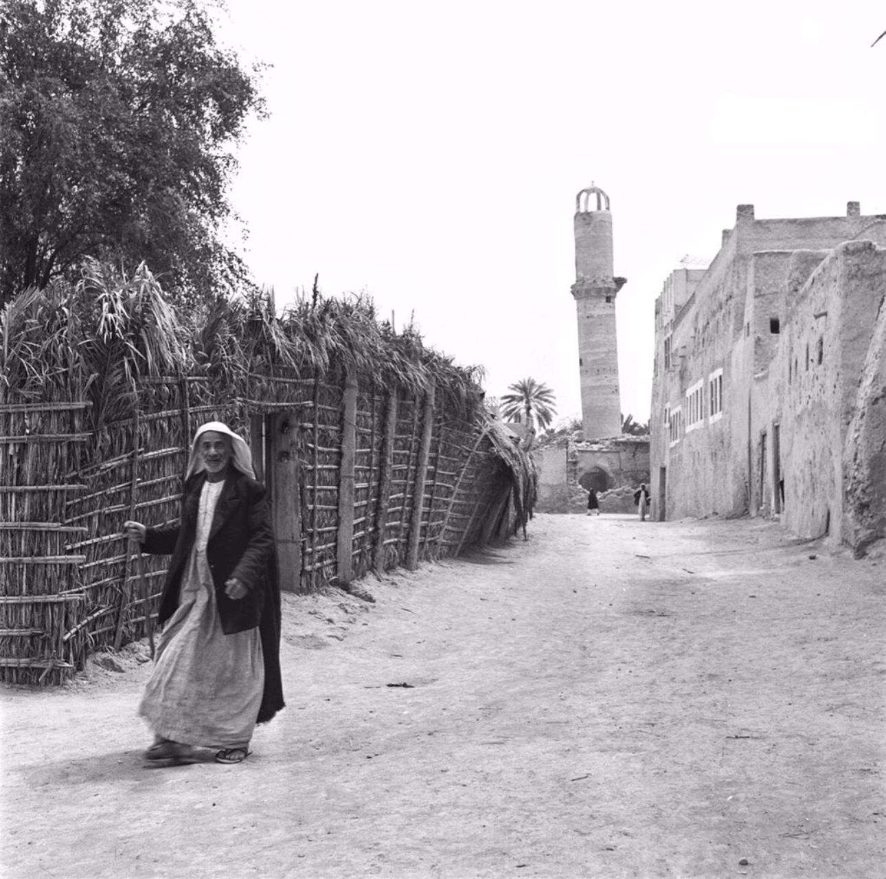 وتُبرز الصورة شارعًا ترابيًا بسيطًا تحفّه من جهة مبانٍ طينية متلاصقة ذات فتحات محدودة، تعكس طبيعة العمارة التقليدية التي اعتمدت على المواد المحلية وأساليب البناء الملائمة للمناخ، فيما تظهر من الجهة المقابلة أسوار من سعف النخيل المشغول، في دلالة واضحة على حضور النخلة بوصفها عنصرًا أساسيًا في الحياة اليومية، سواء في البناء أو التظليل أو تحديد المسارات.