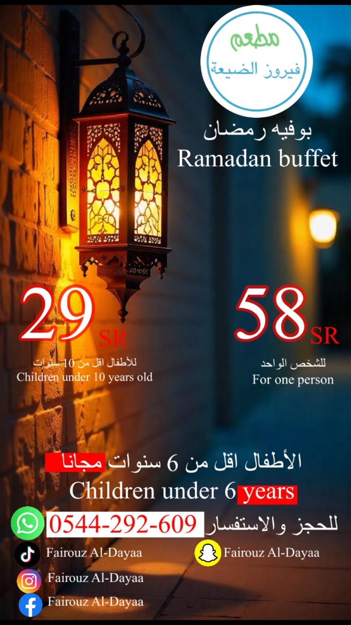 🍽️ يقدّم مطعم «فيروز الضيعة» عرض إفطار رمضاني بنظام بوفيه مفتوح طوال ليالي الشهر الفضيل، في أجواء عائلية مميزة.
