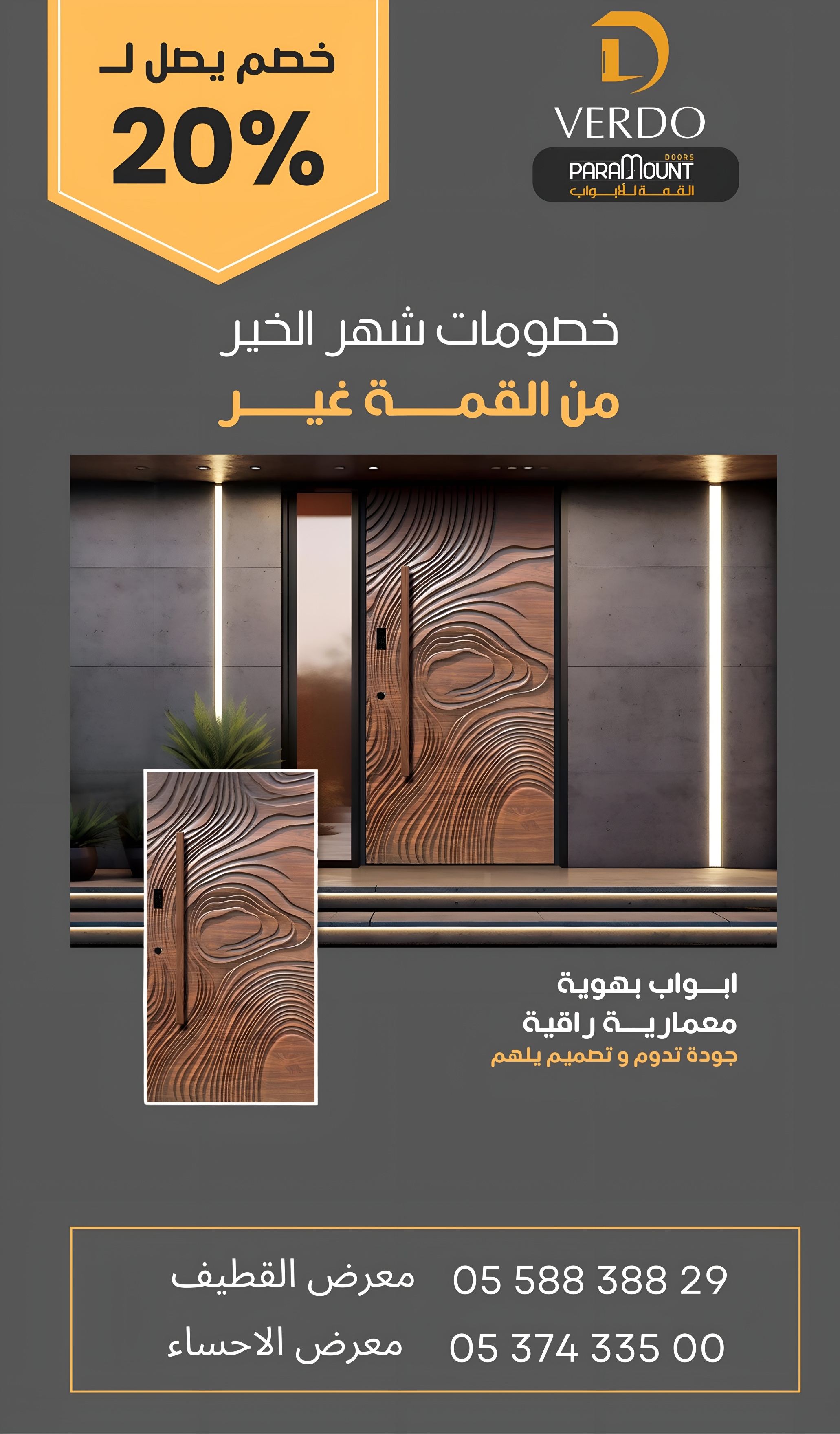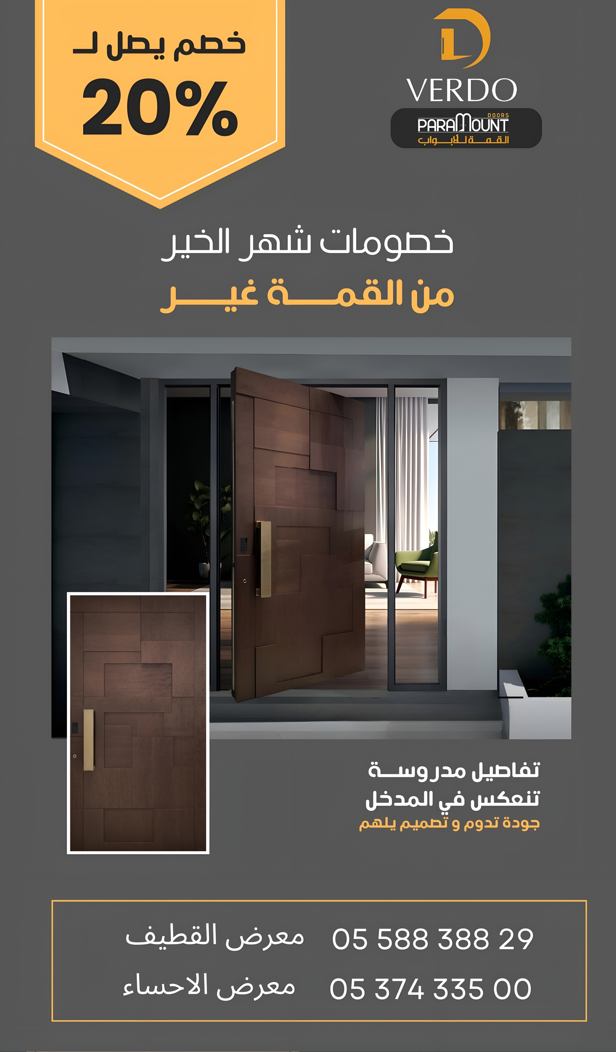 تعلن مجموعة القمة للأبواب عن إطلاق علامتها التجارية الجديدة Verdo في المنطقة الشرقية، المصنّعة وفق أعلى المواصفات الأوروبية، لتقدم مفهومًا جديدًا في الجودة والفخامة.