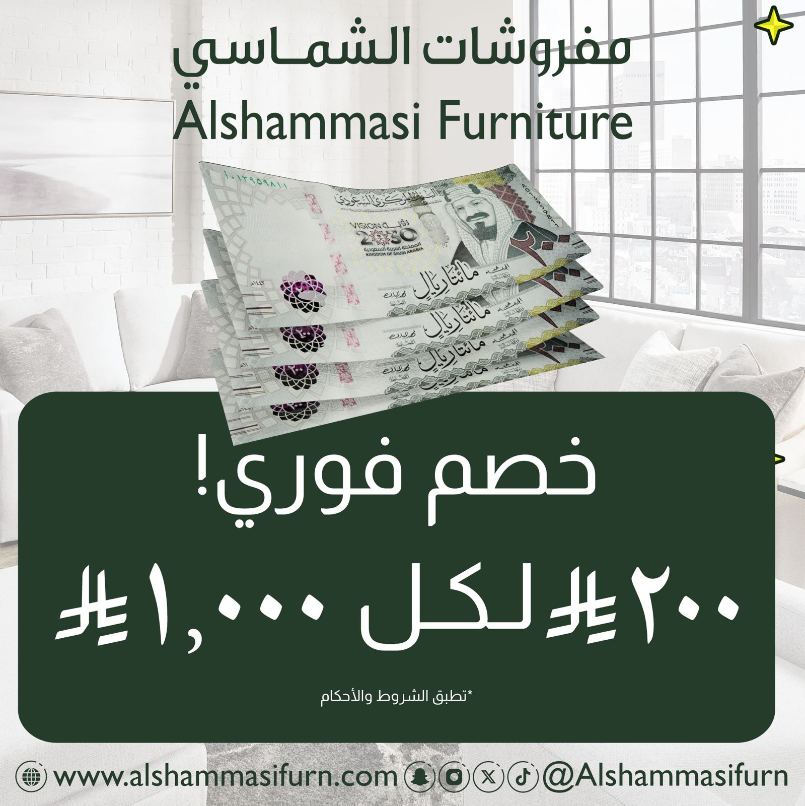 خصم فوري! 200 ريال لكل 1000 ريال في عروض «مفروشات الشماسي»