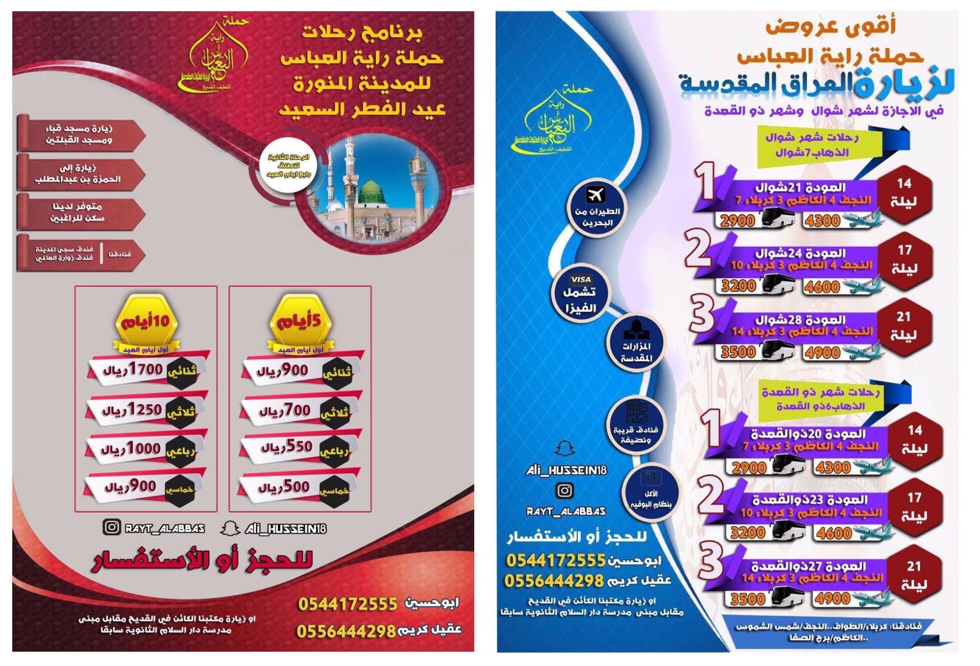 كما تعلن "حملة راية العباس" عن اقوى العروض لزيارة العراق المقدسة في الإجازة في شهري شوال وذي القعدة: